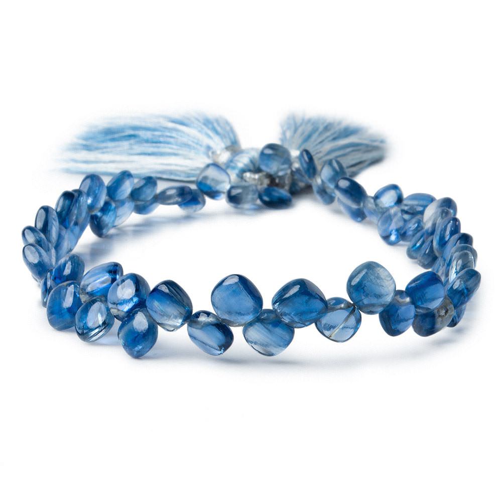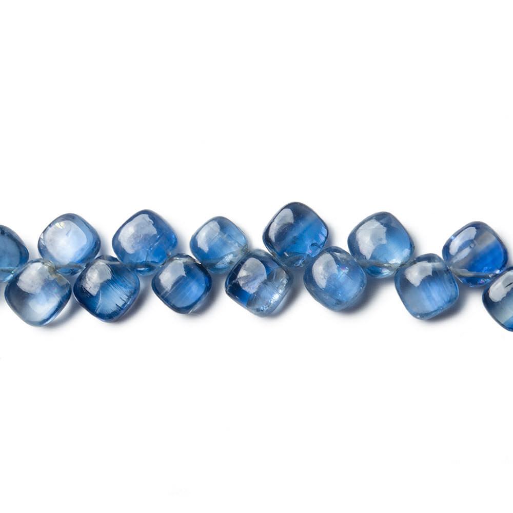 Kyanite Plain Pillows measure approximately 5x5mm average size, have a vitreous luster, excellent polish, a symmetrical shape, transparent body with color zoning, well matched for tone on strand, show internal characteristics, and the bodies are a dark royal blue hue showing a silvery schiller.