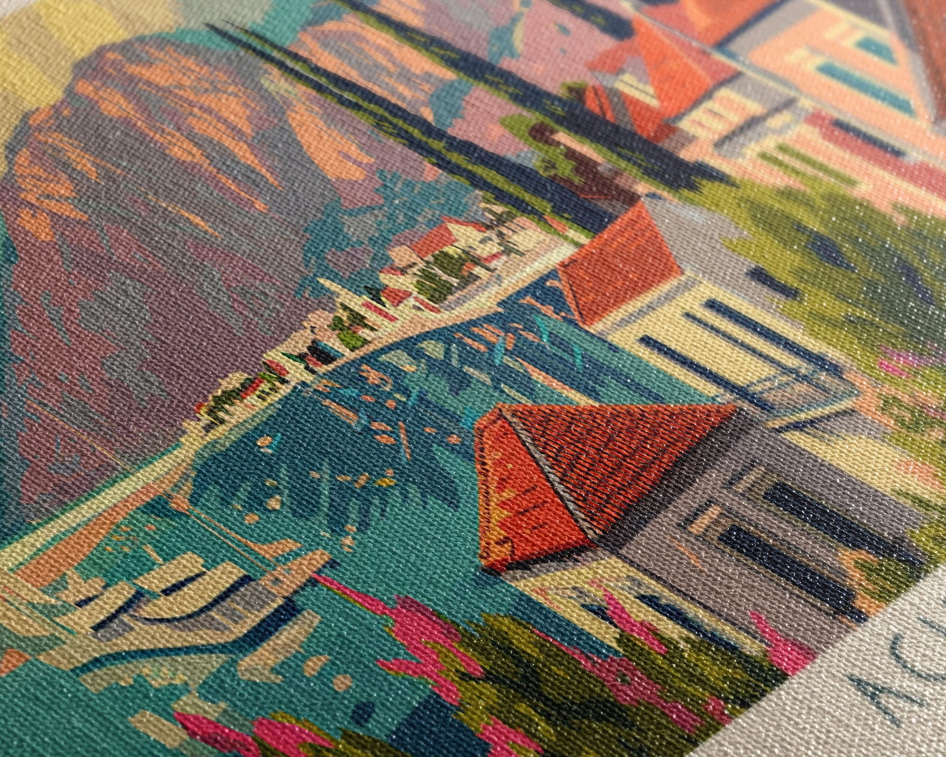 Most of our canvases are made in the USA, with the exception of canvases ordered with the light oak unstained frames, and any large canvases (24x48, 30x60, 16x48 and 20x60) ordered WITH a frame. These are temporarily made in and shipped from Europe, while we try to find a more consistent supplier in the USA.