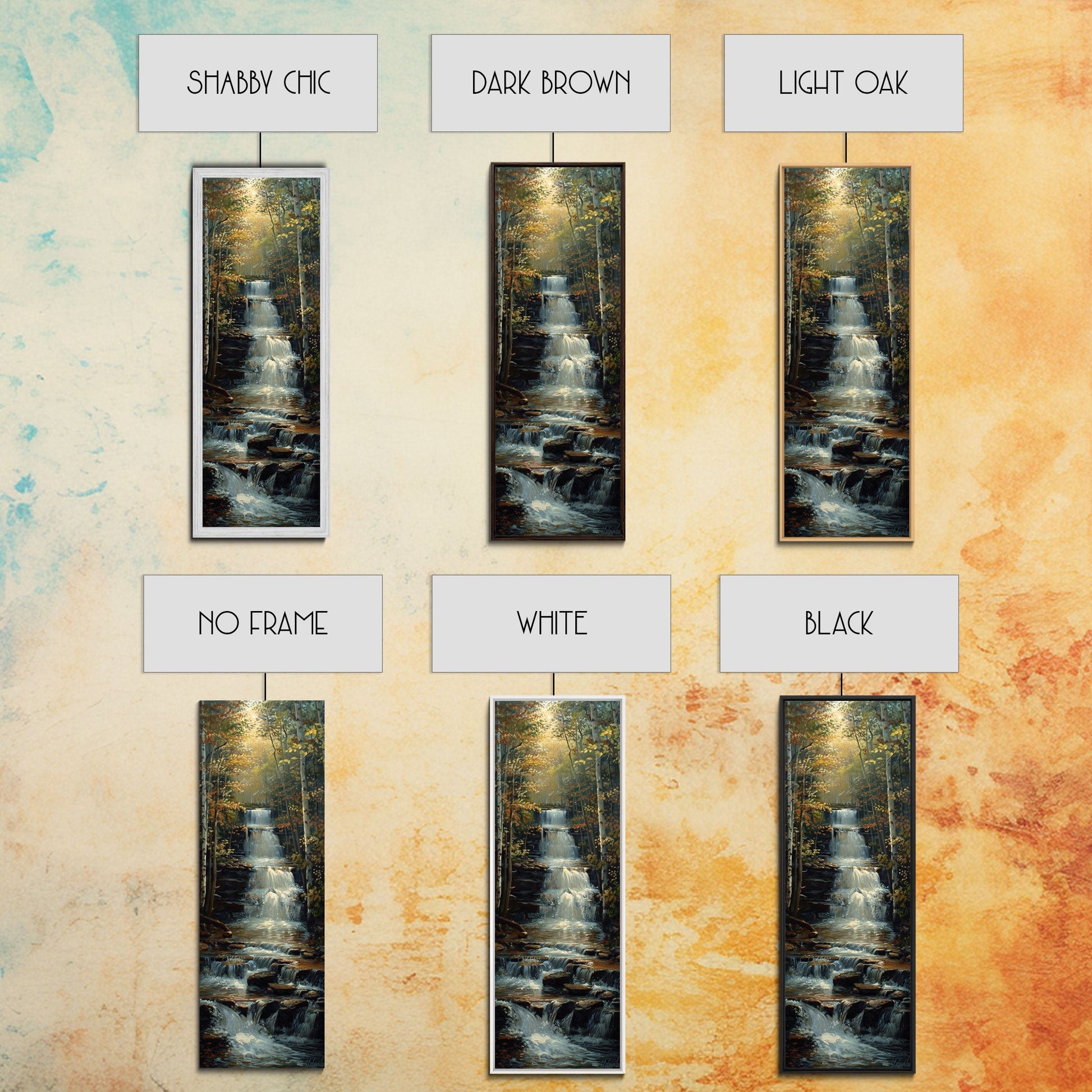 Beautiful Stream Cascading Waterfalls In The Forest at Golden Hour, Framed Canvas Print, Boho Style Landscape Painting Print