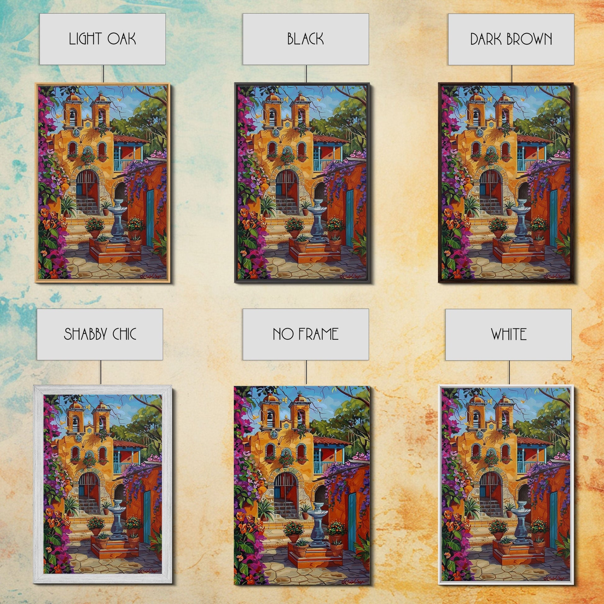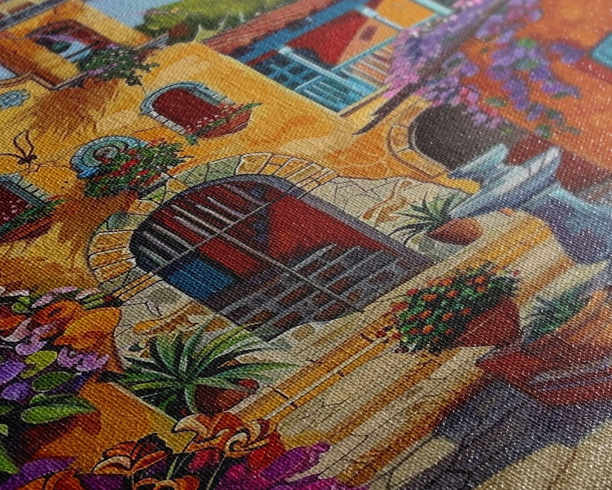 Bright Mexican Style Tall Art Framed Canvas Print Depicting Ornate Blue Door And Rustic Courtyard