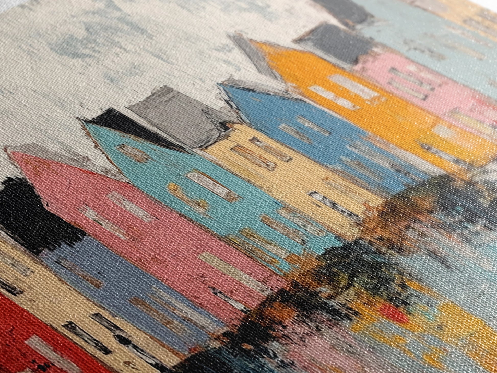 Coastal Village Houses Framed Canvas Print Colorful Seaside Town Painting Rustic Home Wall Art Nautical Decor Large Wall Art