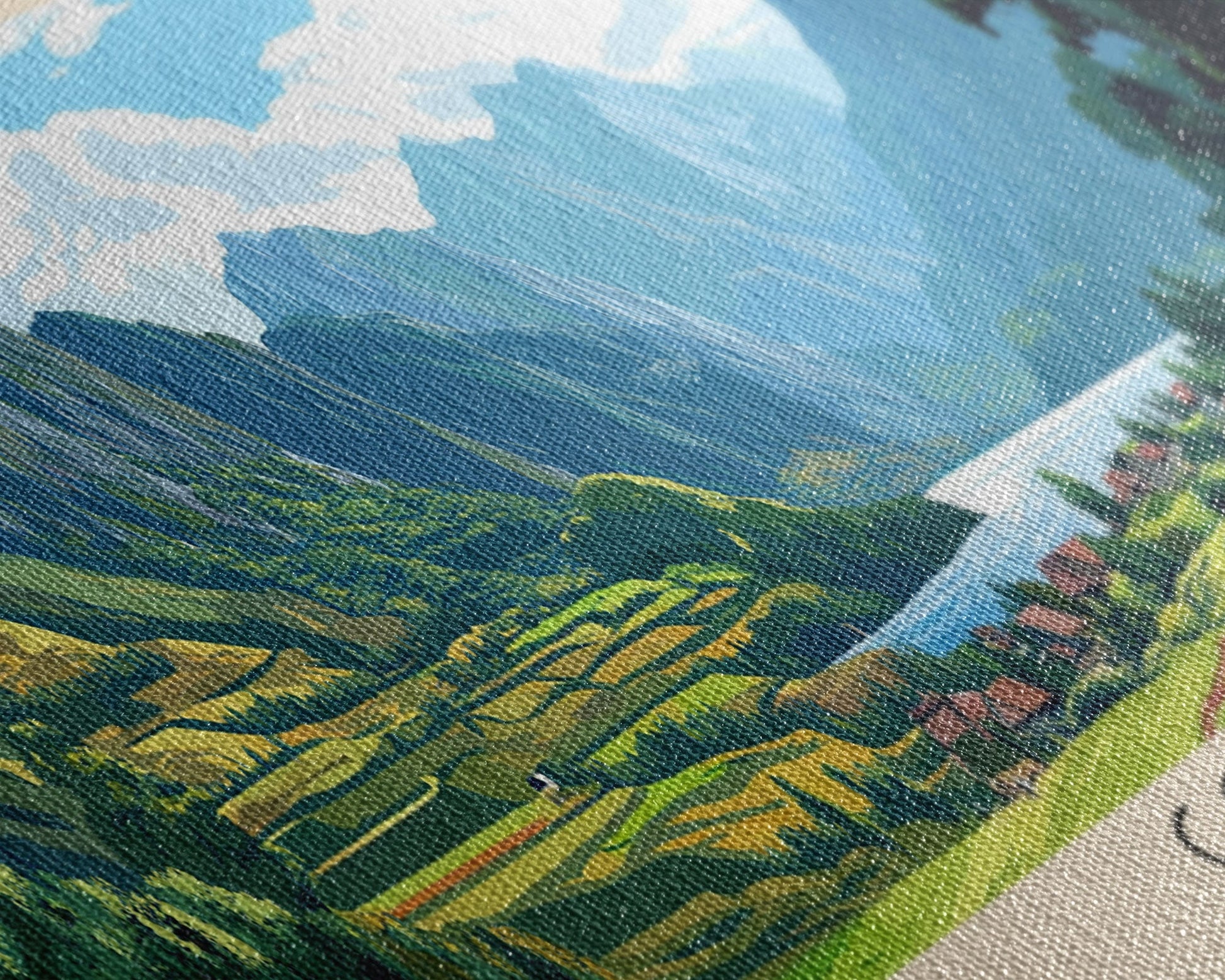 Most of our canvases are made in the USA, with the exception of canvases ordered with the light oak unstained frames, and any large canvases (24x48, 30x60, 16x48 and 20x60) ordered WITH a frame. These are temporarily made in and shipped from Europe, while we try to find a more consistent supplier in the USA.