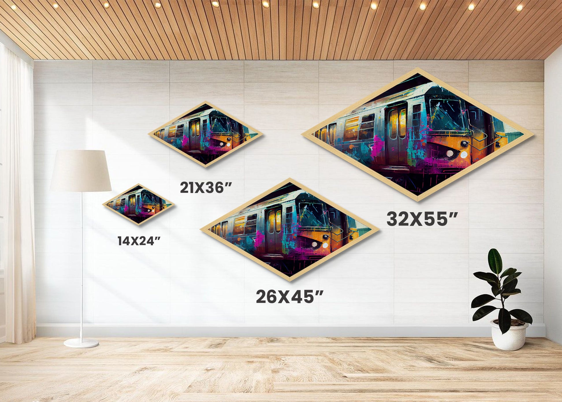 Color Splashed Metro – Diamond Shaped Street Art Subway Canvas Embossed Print, Vibrant Urban Train Graffiti Home Accent