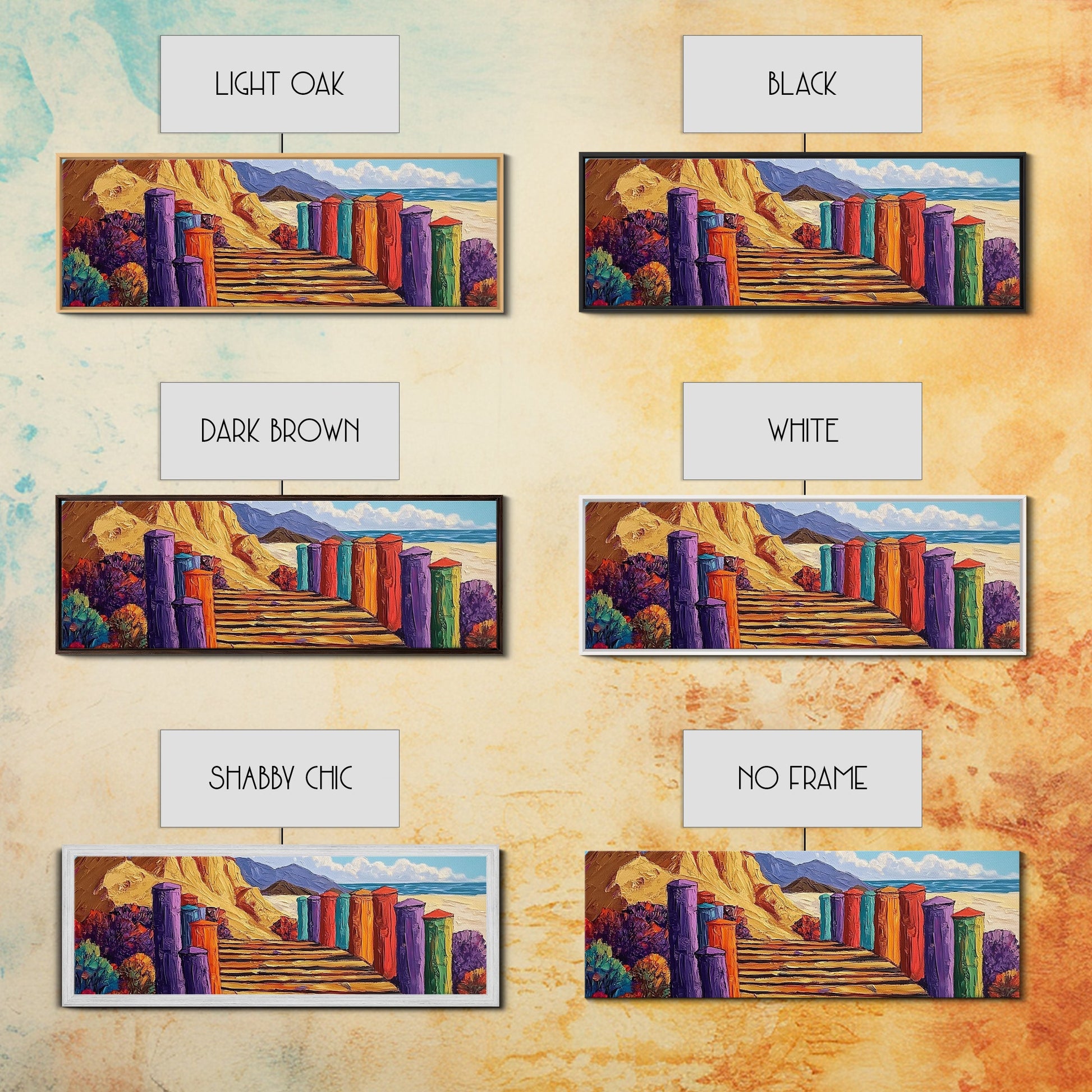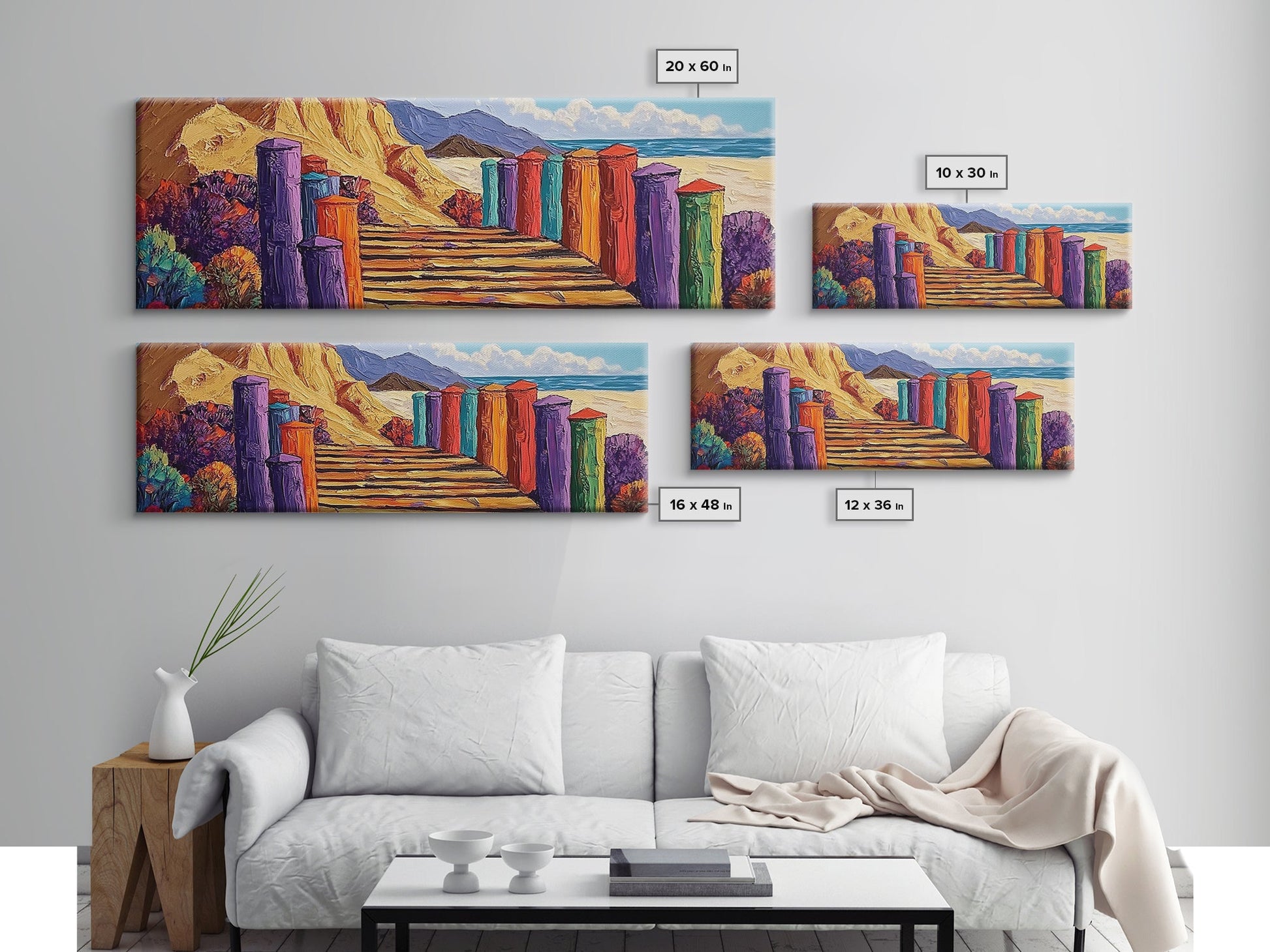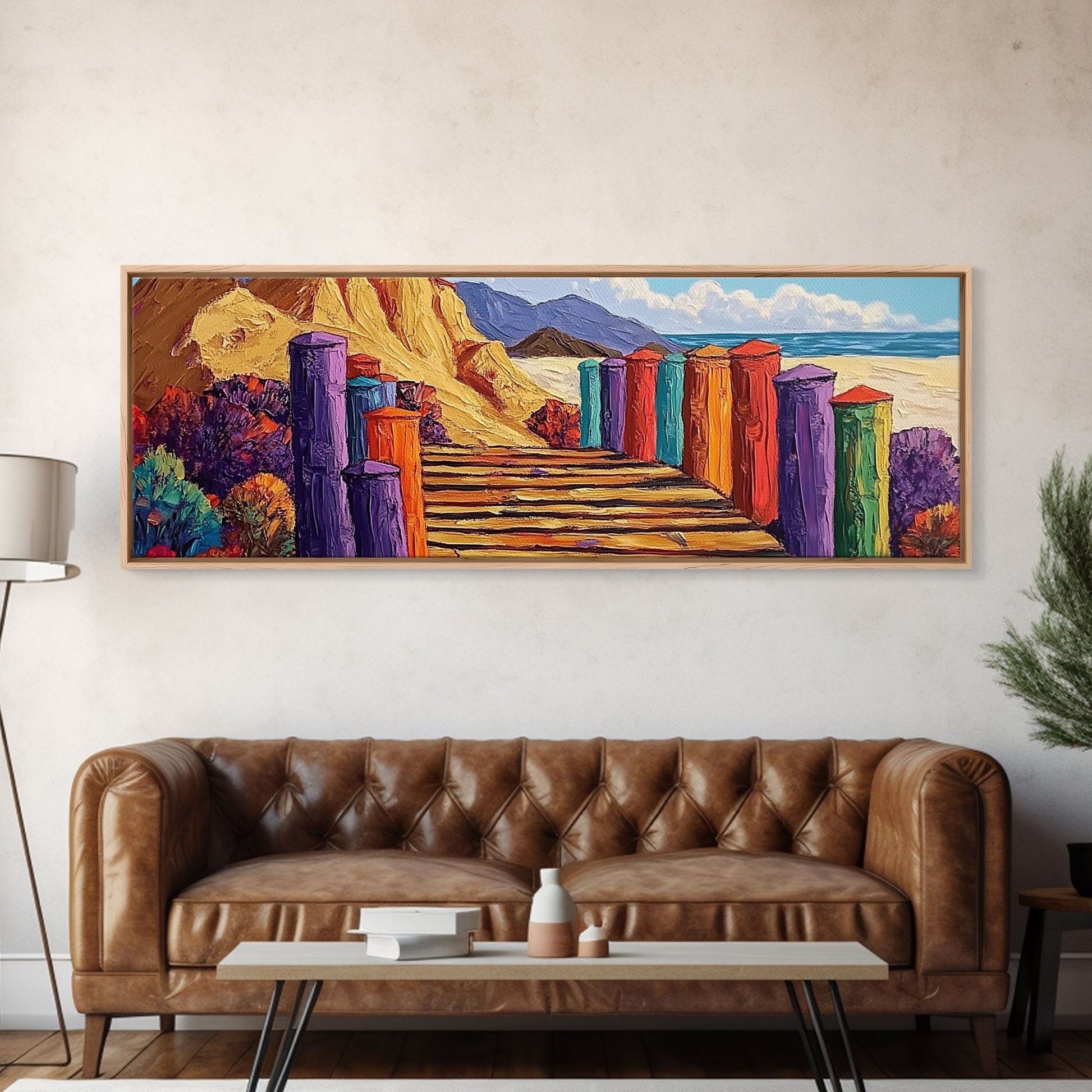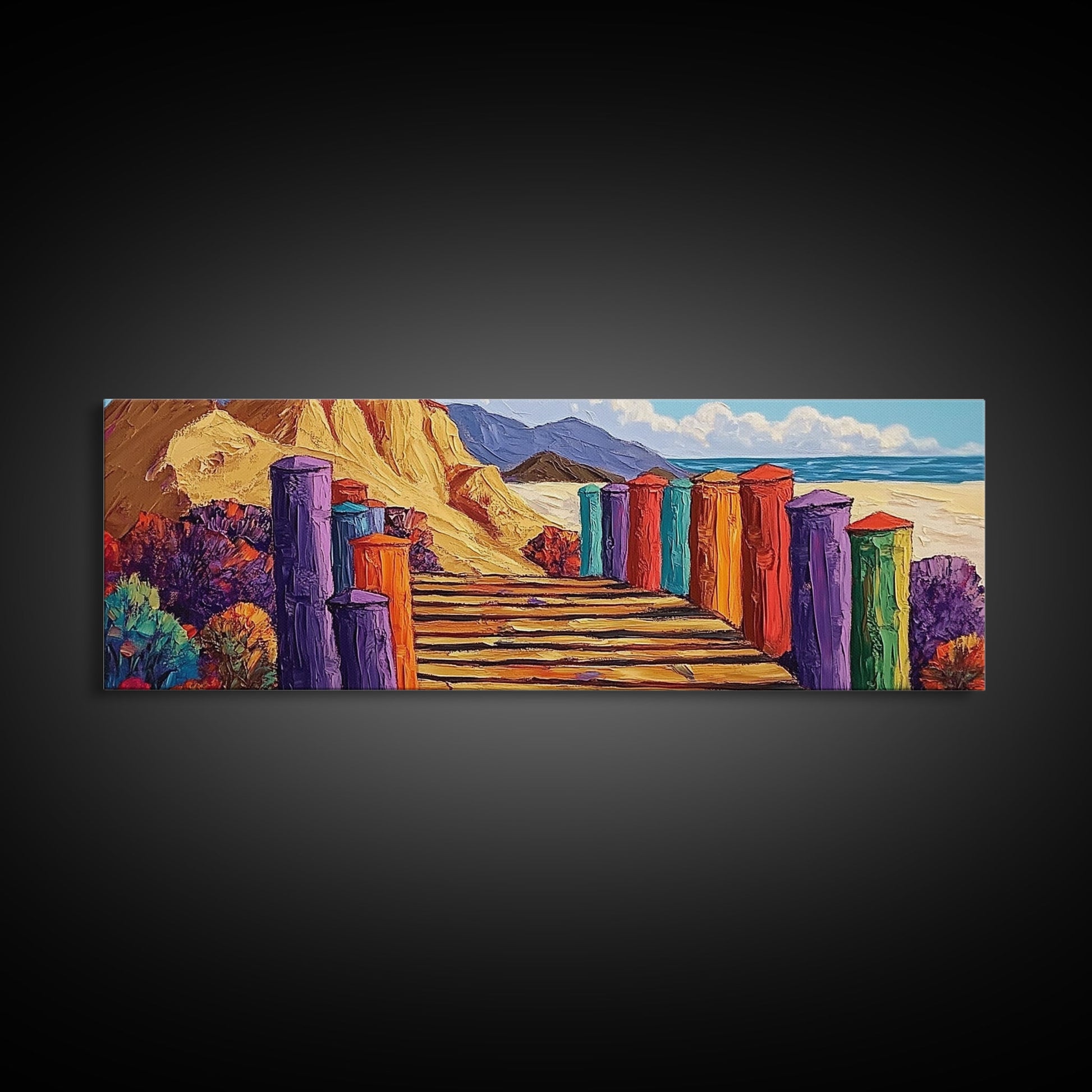 Colorful Cabins, Beach Path, Coastal Walkway, Vibrant Landscape, Canvas Print, Entryway Wall Art, Beach House Art, Bold Palette Decor