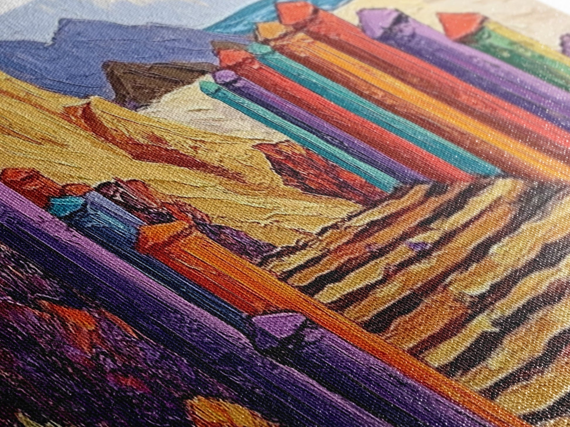 Most of our canvases are made in the USA, with the exception of canvases ordered with the light oak unstained frames, and any large canvases (24x48, 30x60, 16x48 and 20x60) ordered WITH a frame. These are temporarily made in and shipped from Europe, while we try to find a more consistent supplier in the USA.