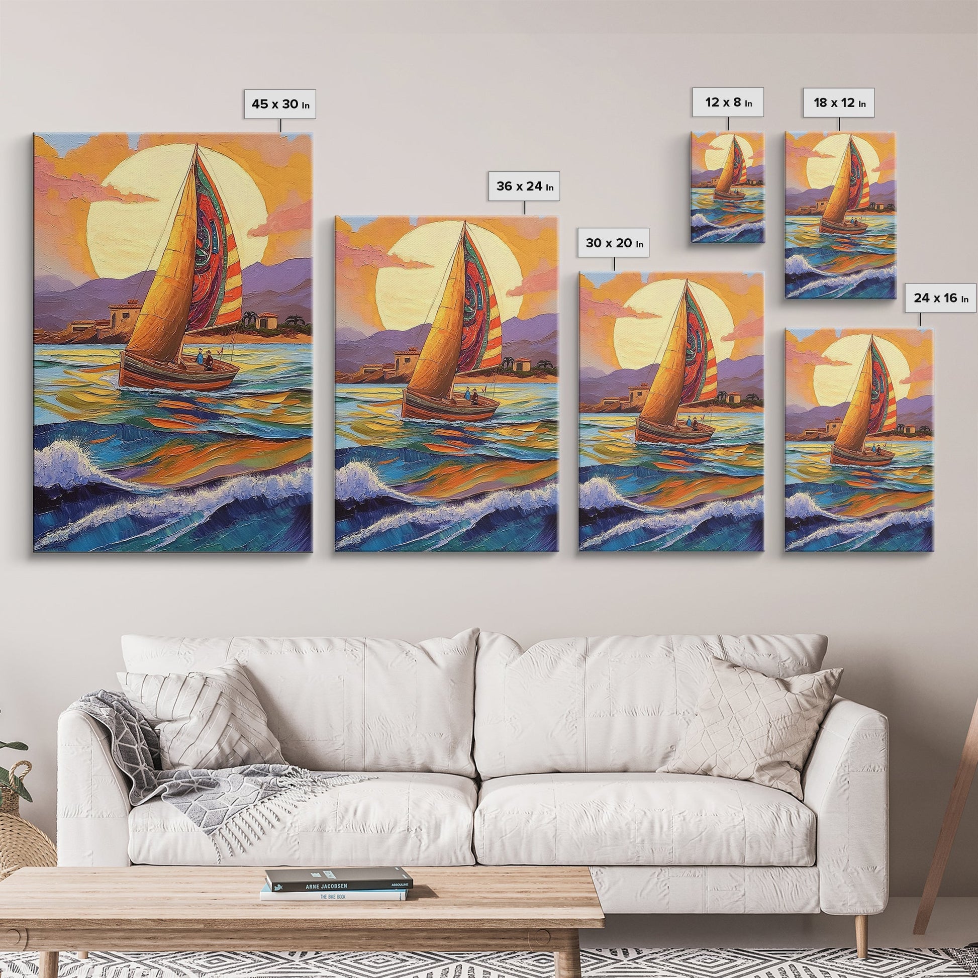 Colorful Sailboat, Coastal Adventure, Sunset Sea, Nautical Art, Living Room Wall Art, Tropical Decor, Framed Canvas Print, Ocean Vibes
