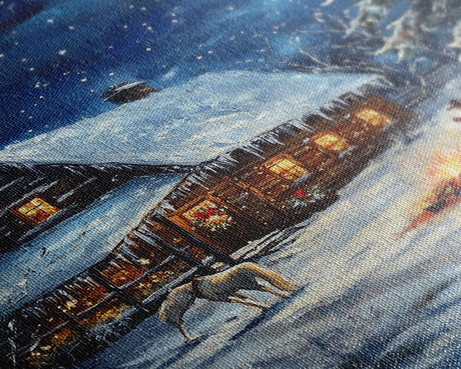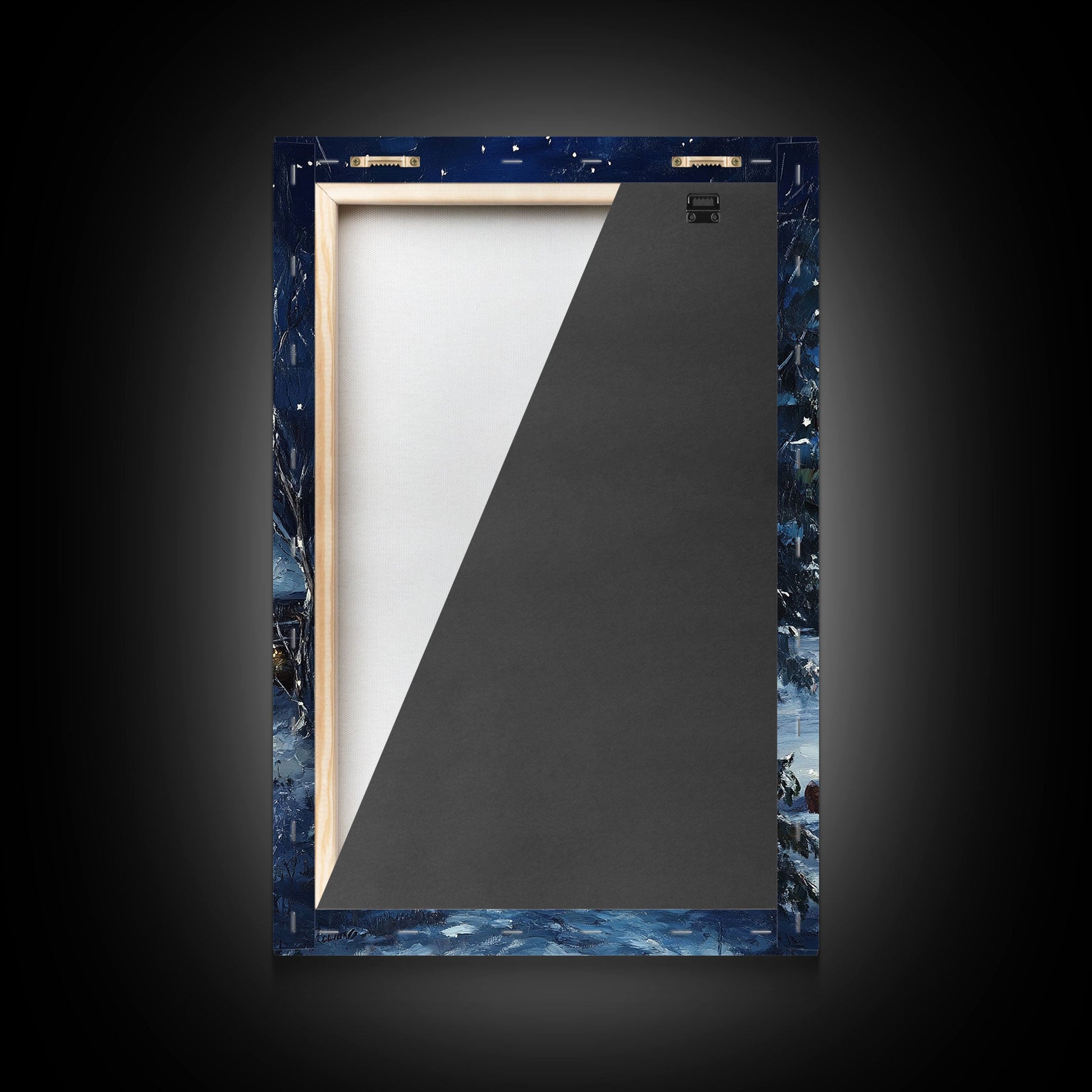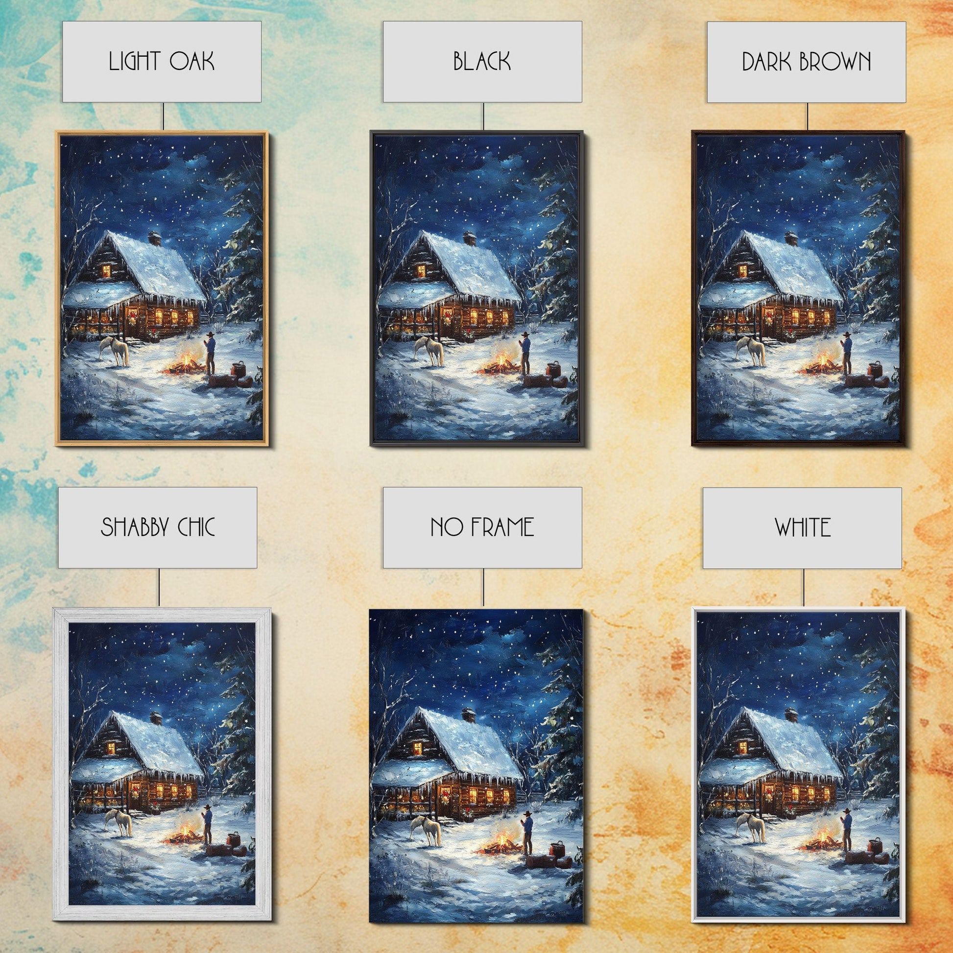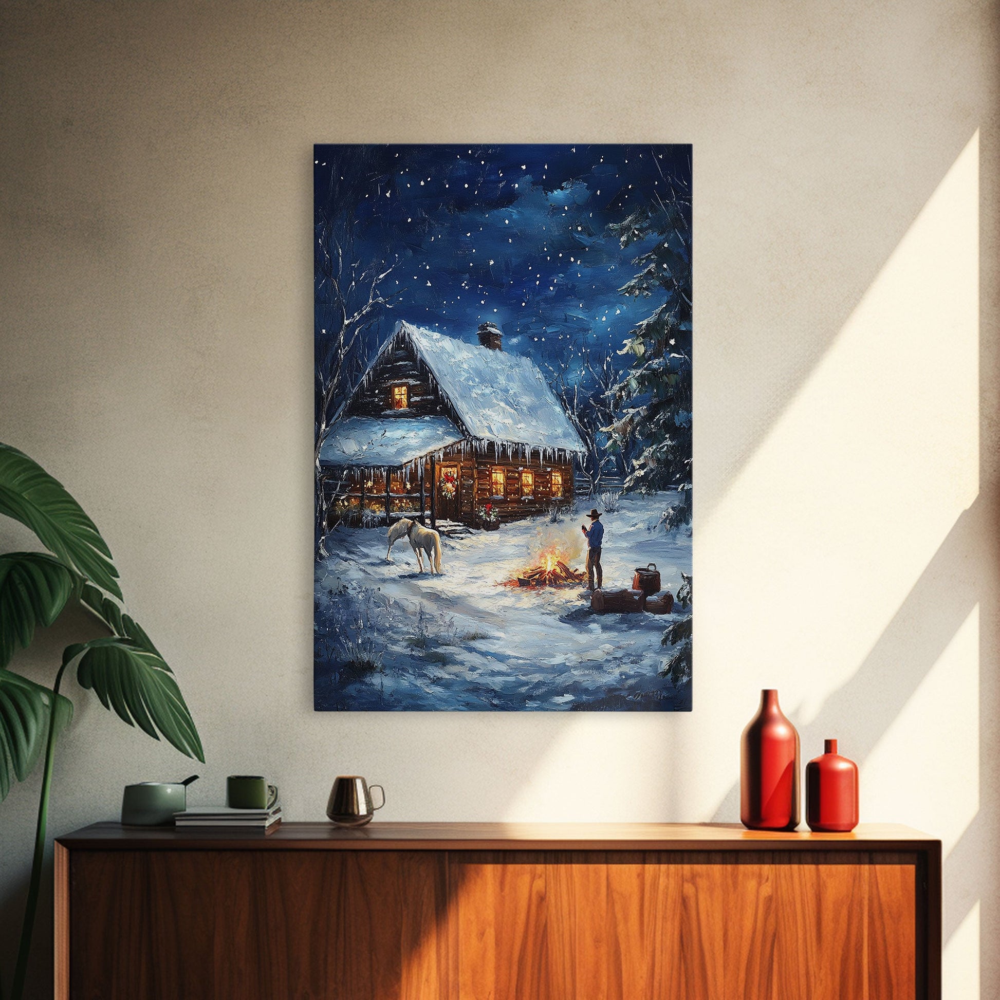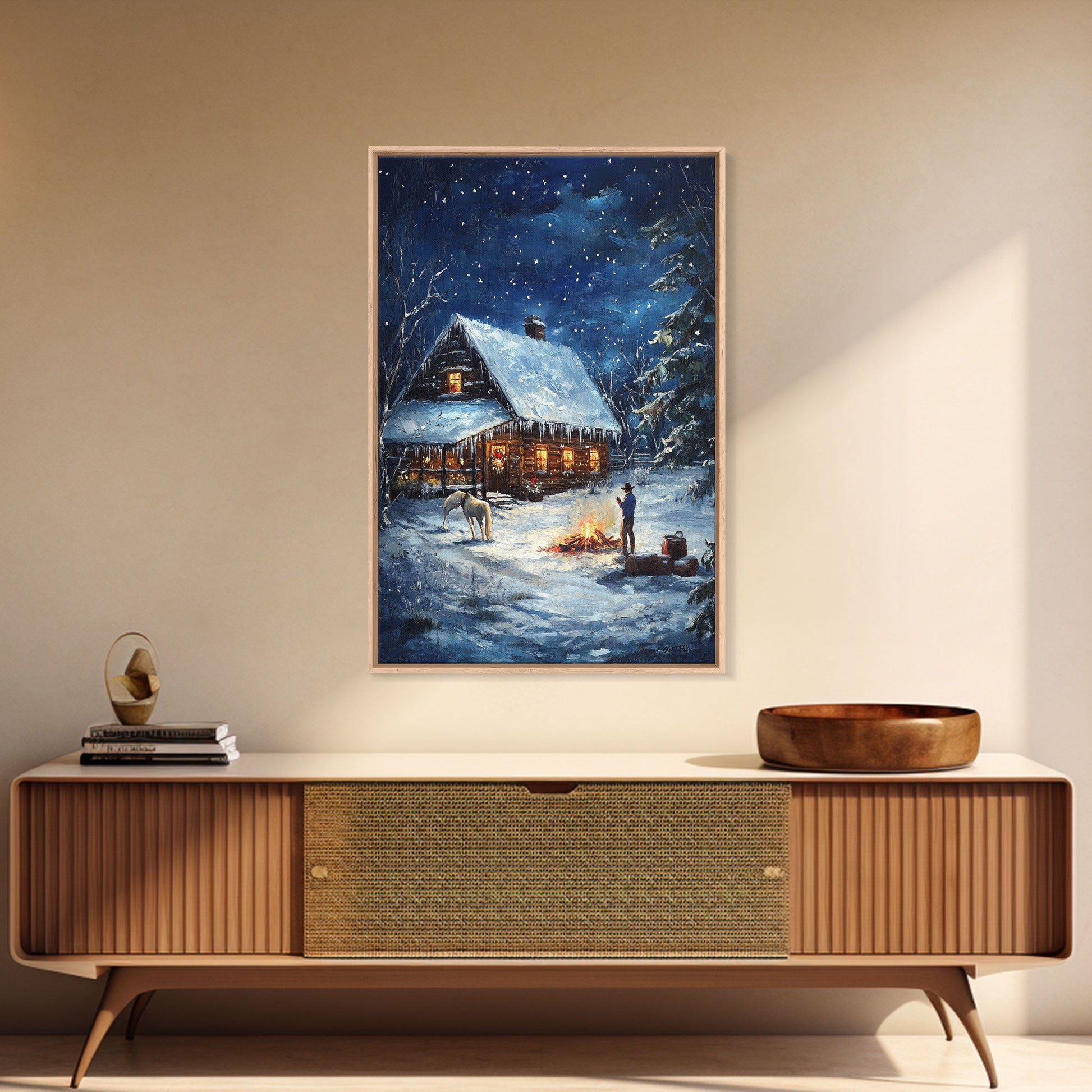 Cowboy Christmas by the Fire Framed Canvas Print, Western Holiday Decor with Snowy Cabin, Cozy Art Perfect for Rustic Christmas Winter Decor