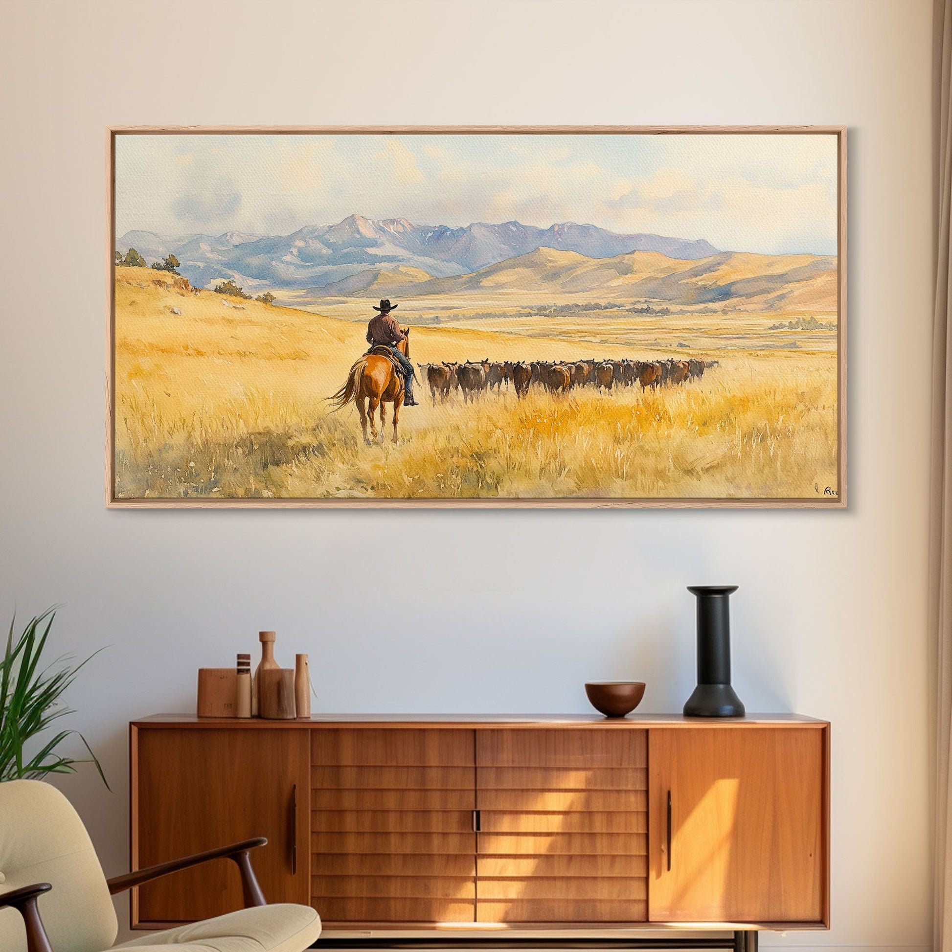 Cowboy On Snowy Path Framed Canvas Print Tall Art Winter Wonderland Western Christmas Decor Rustic Winter Wall Art Gift Cowboy Holiday Gift