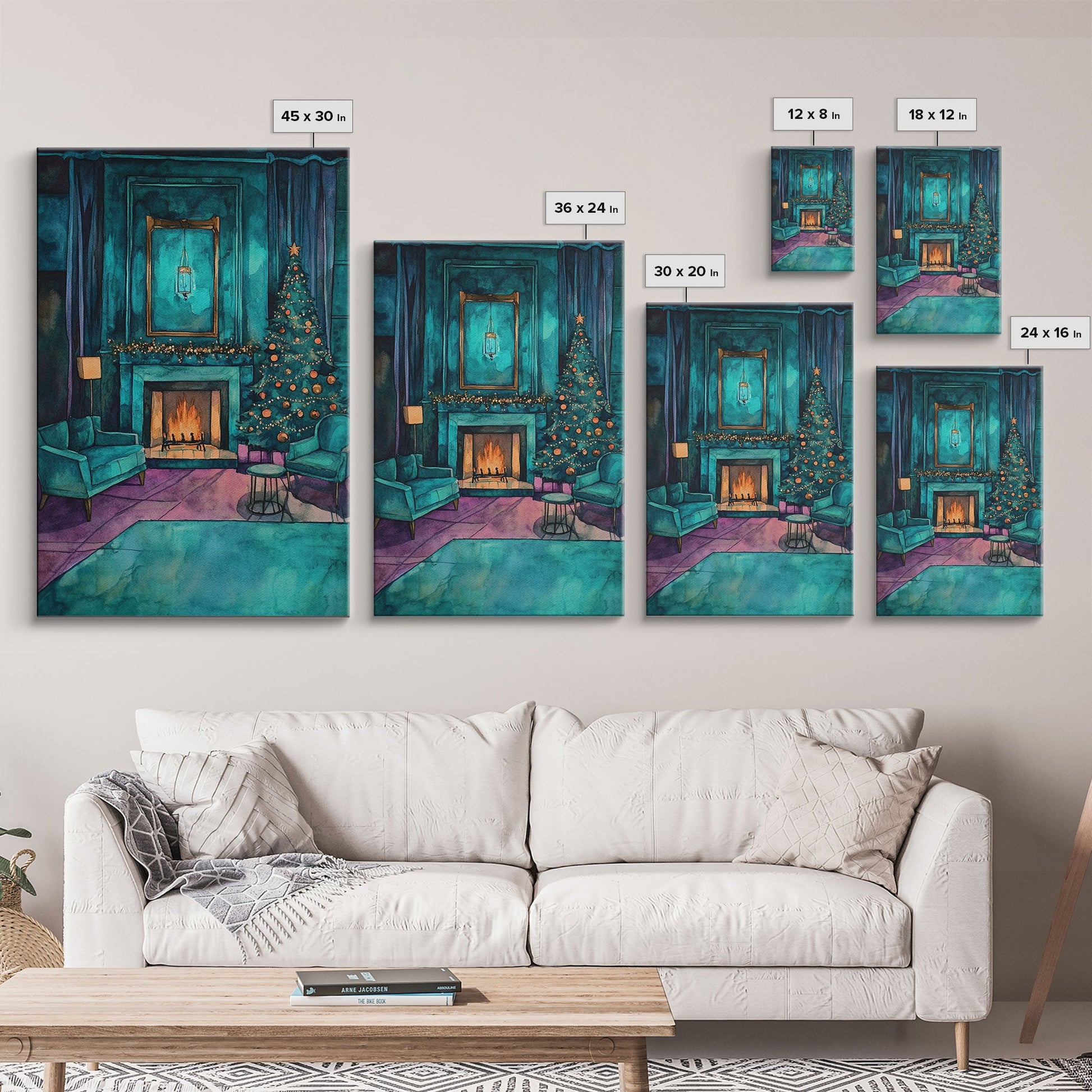 Cozy living room with Christmas tree and fireplace, Framed Canvas Print, Christmas wall art, perfect modern farmhouse holiday decor