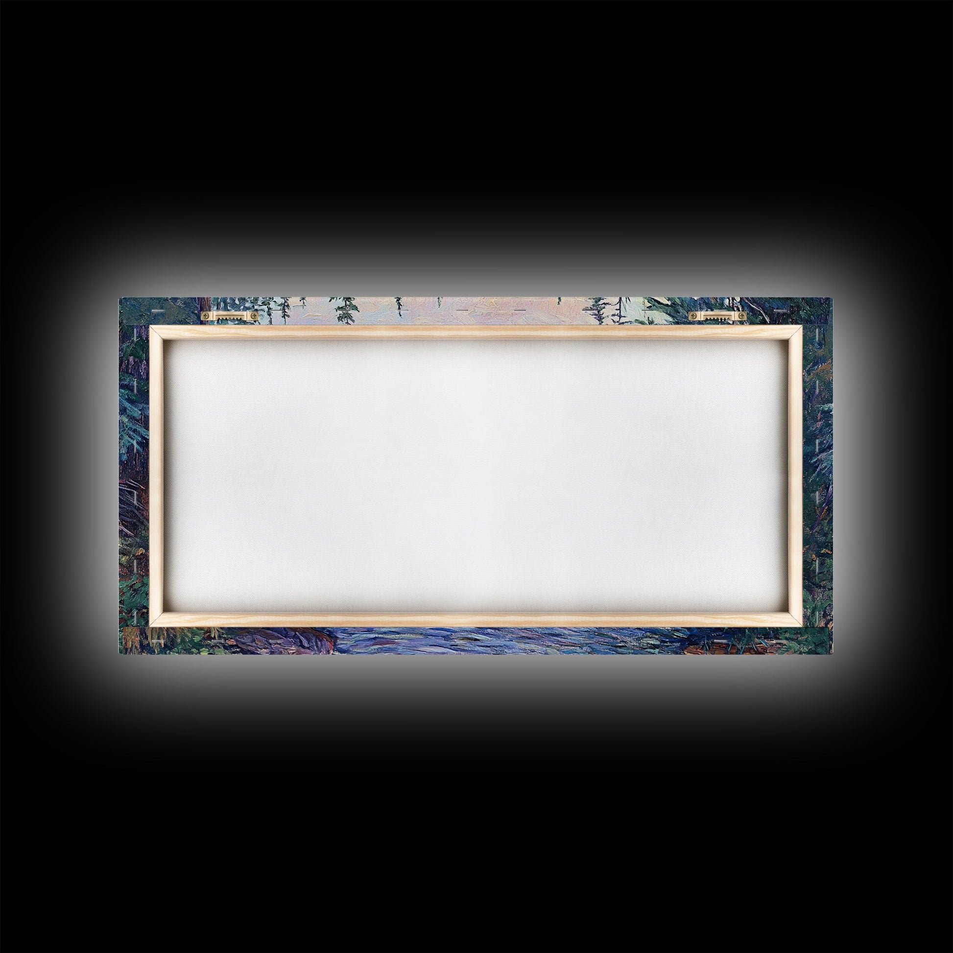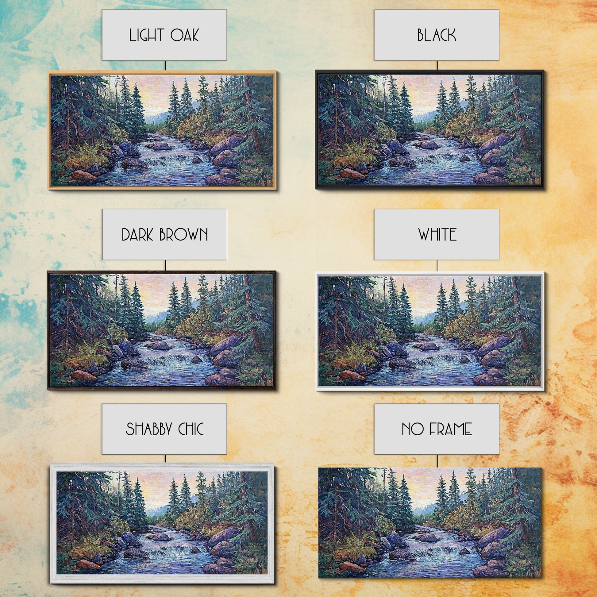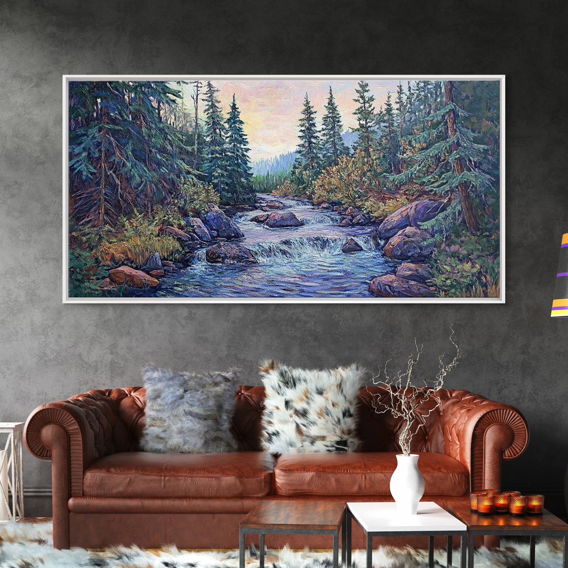 Forest River Scene, pine tree art, mountain painting, landscape painting, smoky mountain art, rustic decor, Framed Canvas Print