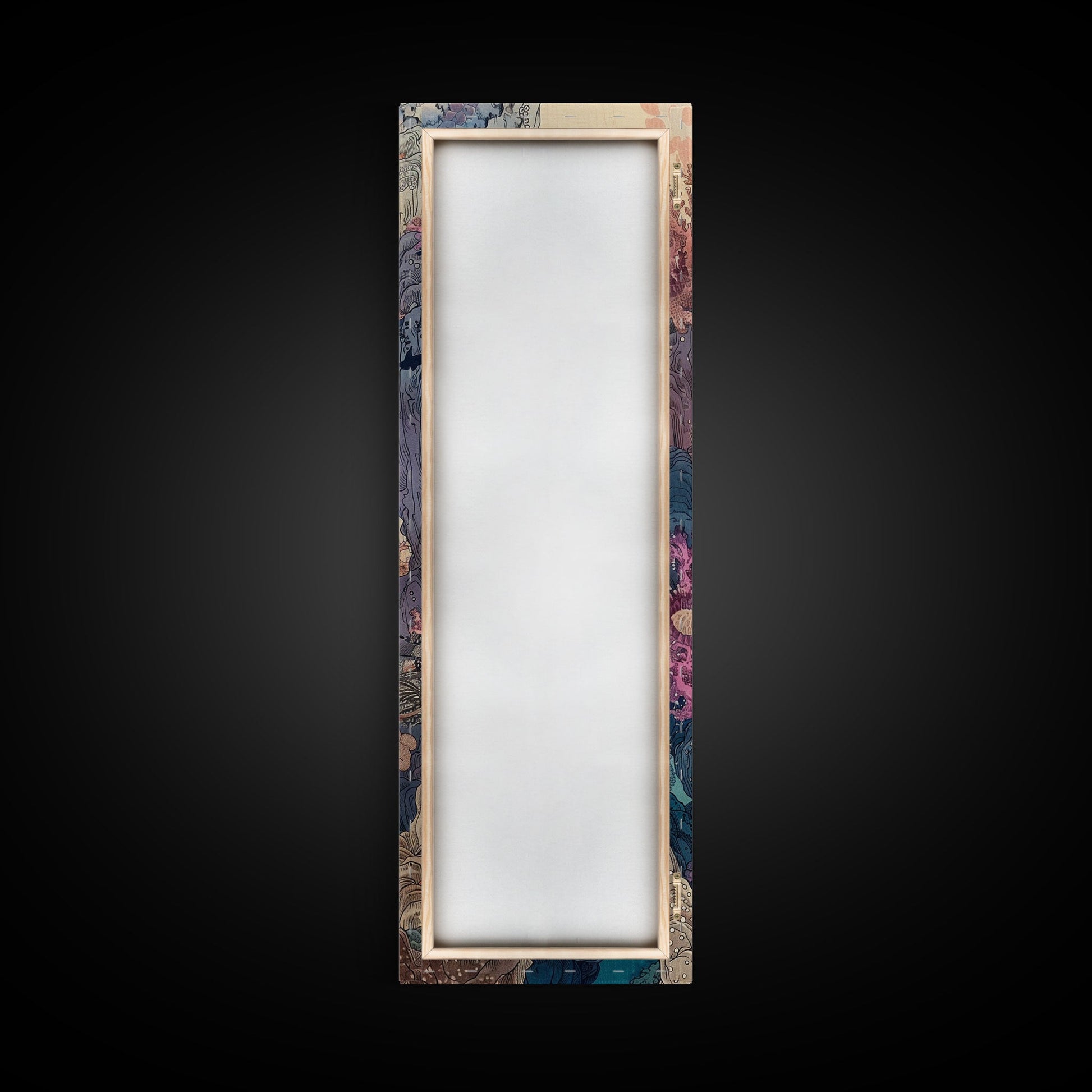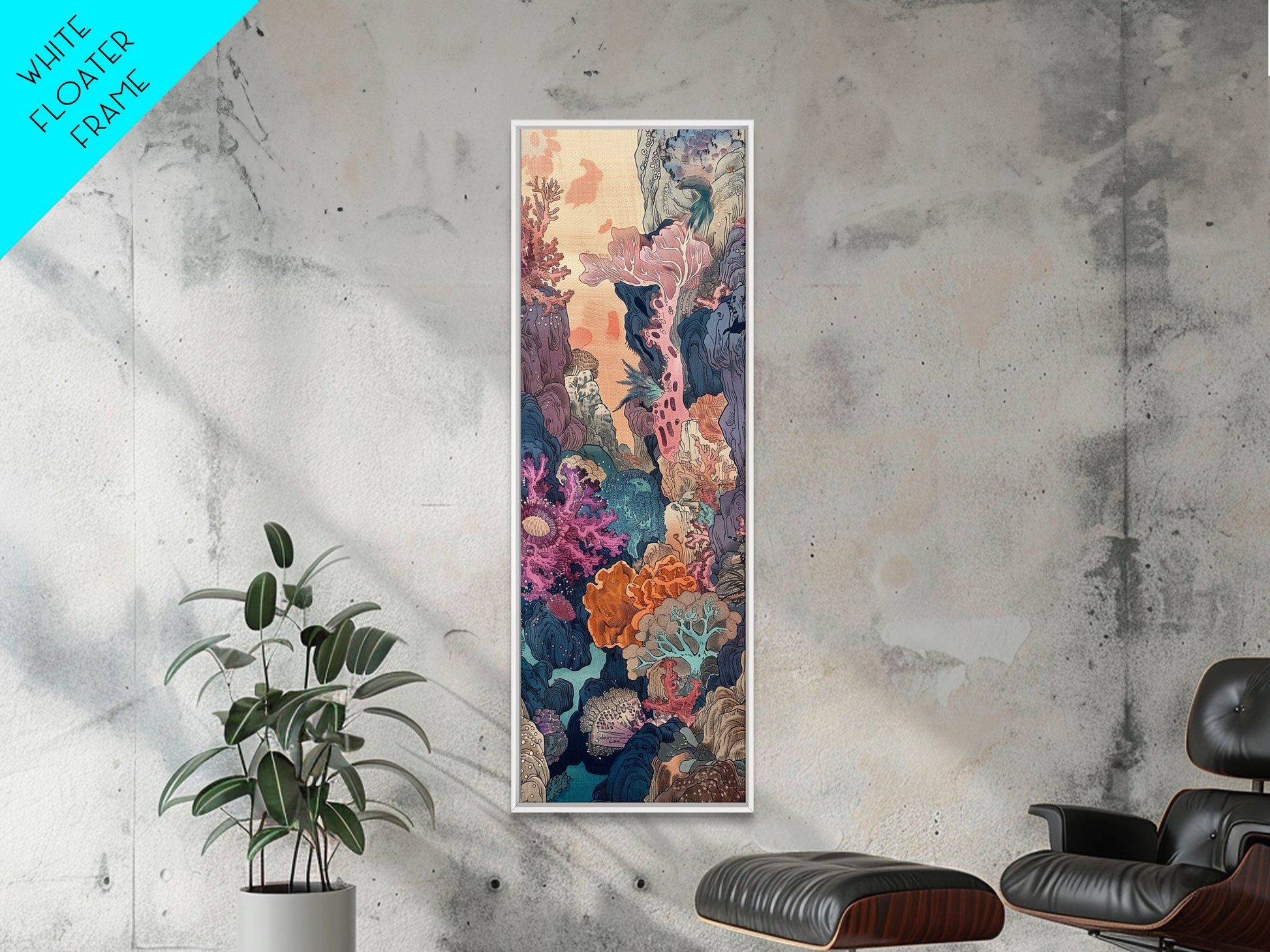 Framed Canvas Print Of A Coral Reef Scene Filled With Vibrant Marine Life, Skinny Art, Tall Art, Japanese Style Art, Ukiyo-e Art, Wood Block Print