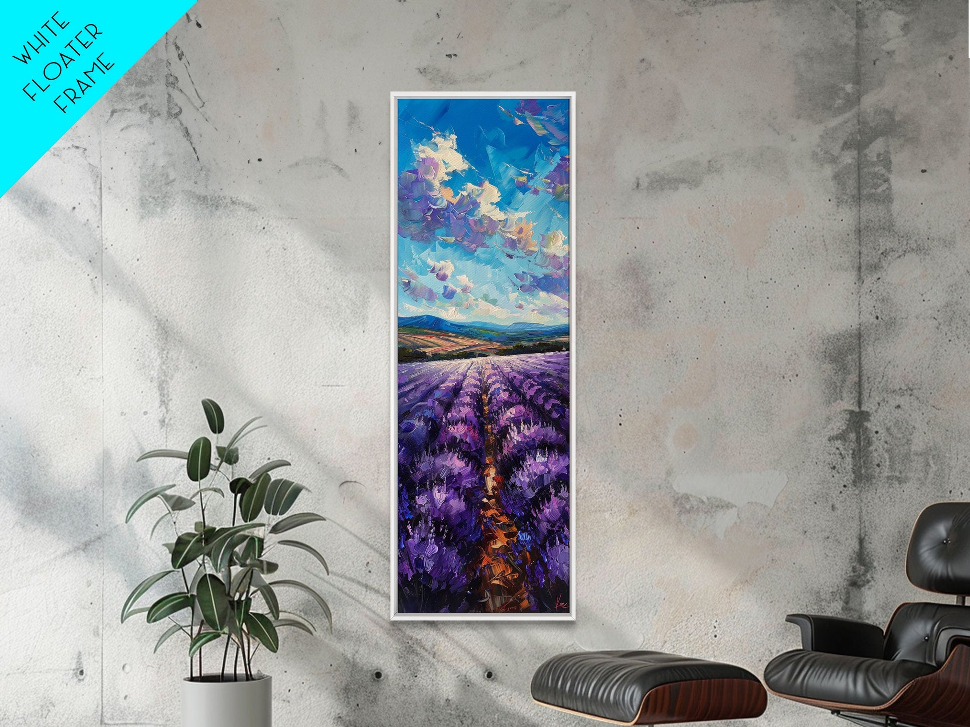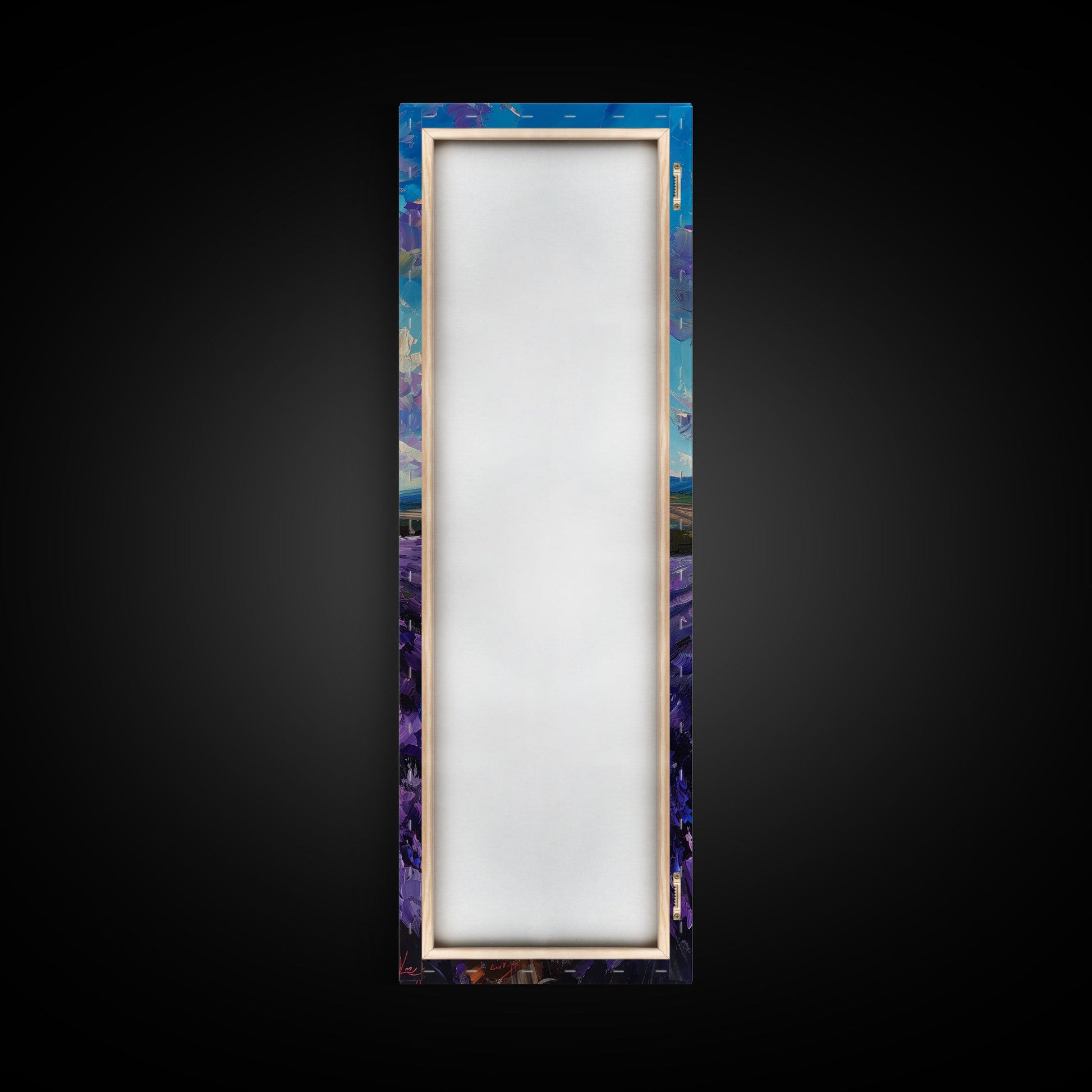 Framed Canvas Print of Wide Lavender Fields Under a Bright Sky Featuring Skinny Tall Art for Stunning Wall Decor in Home or Office