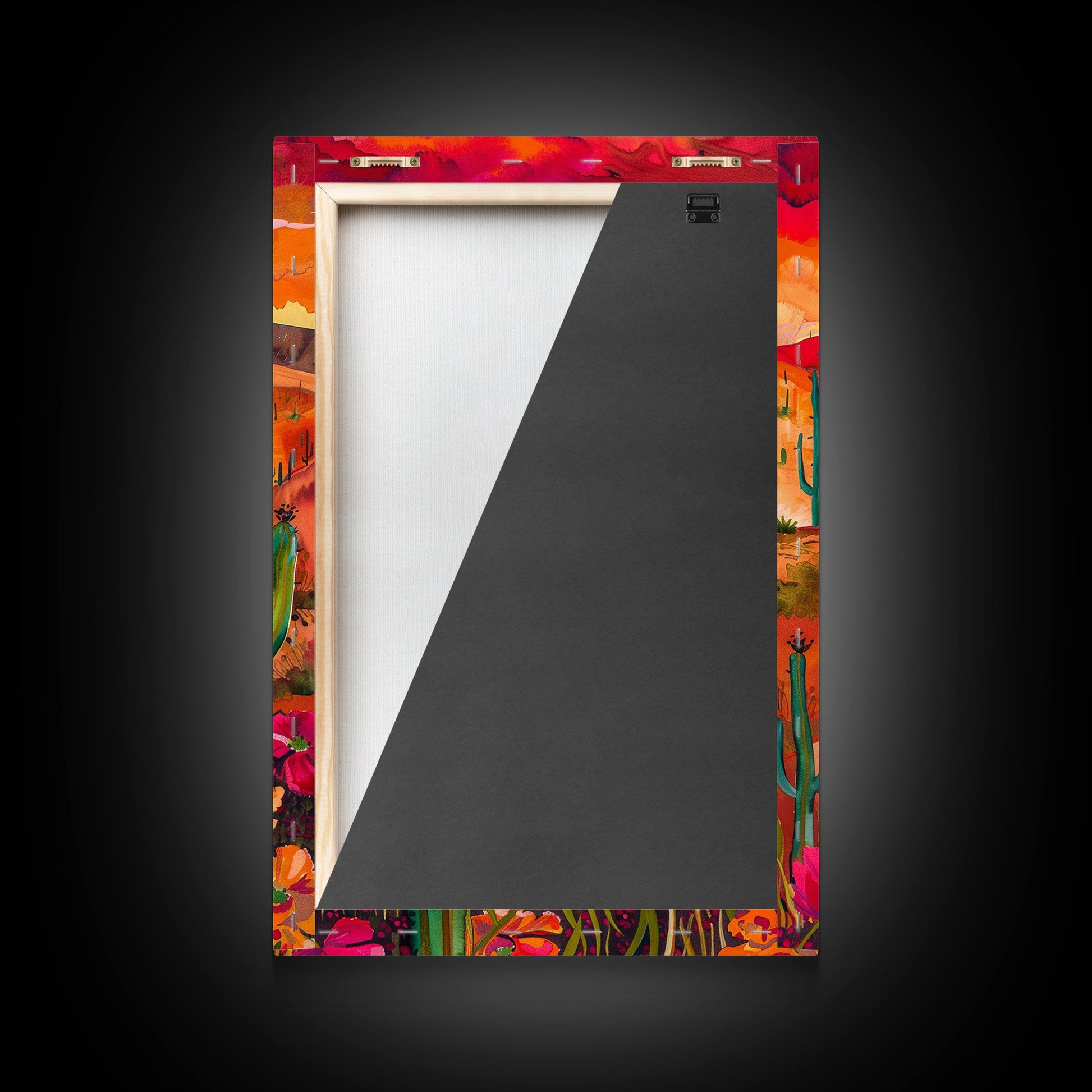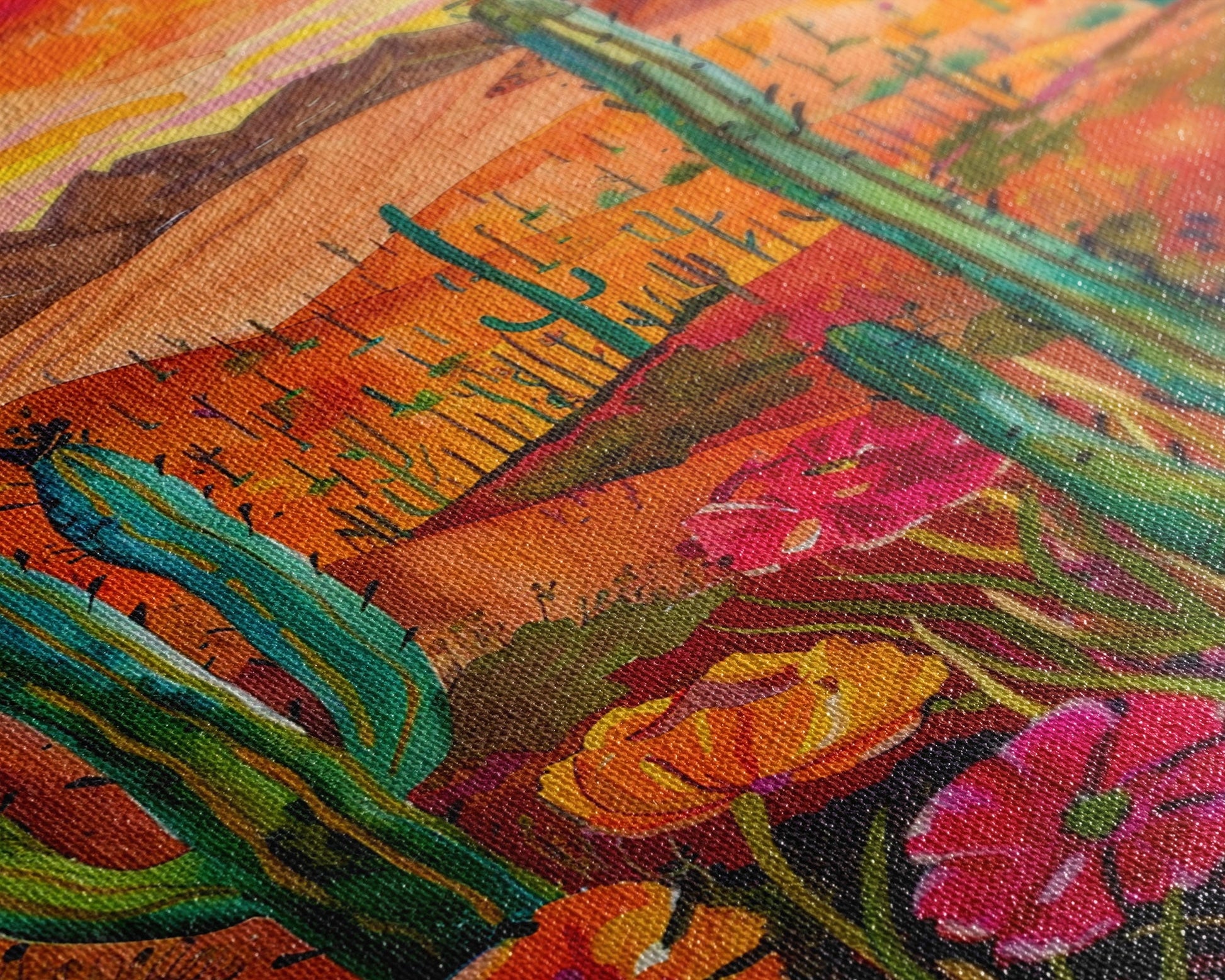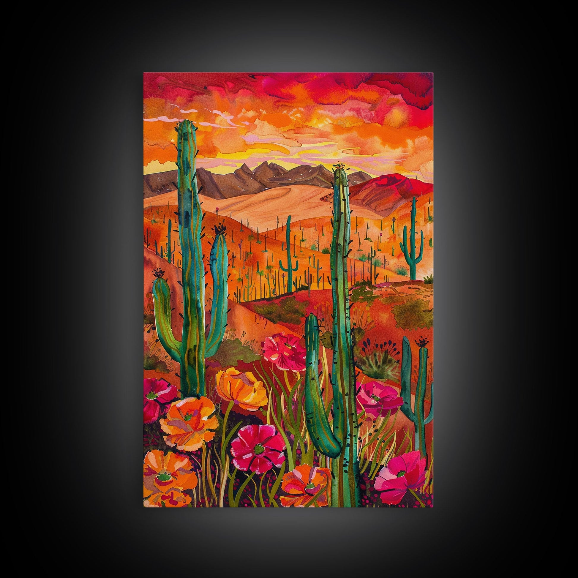Framed Canvas Print, Vibrant Desert Landscape with Flowers and Cacti, Perfect Wall Art for Living Room or Bedroom Decor