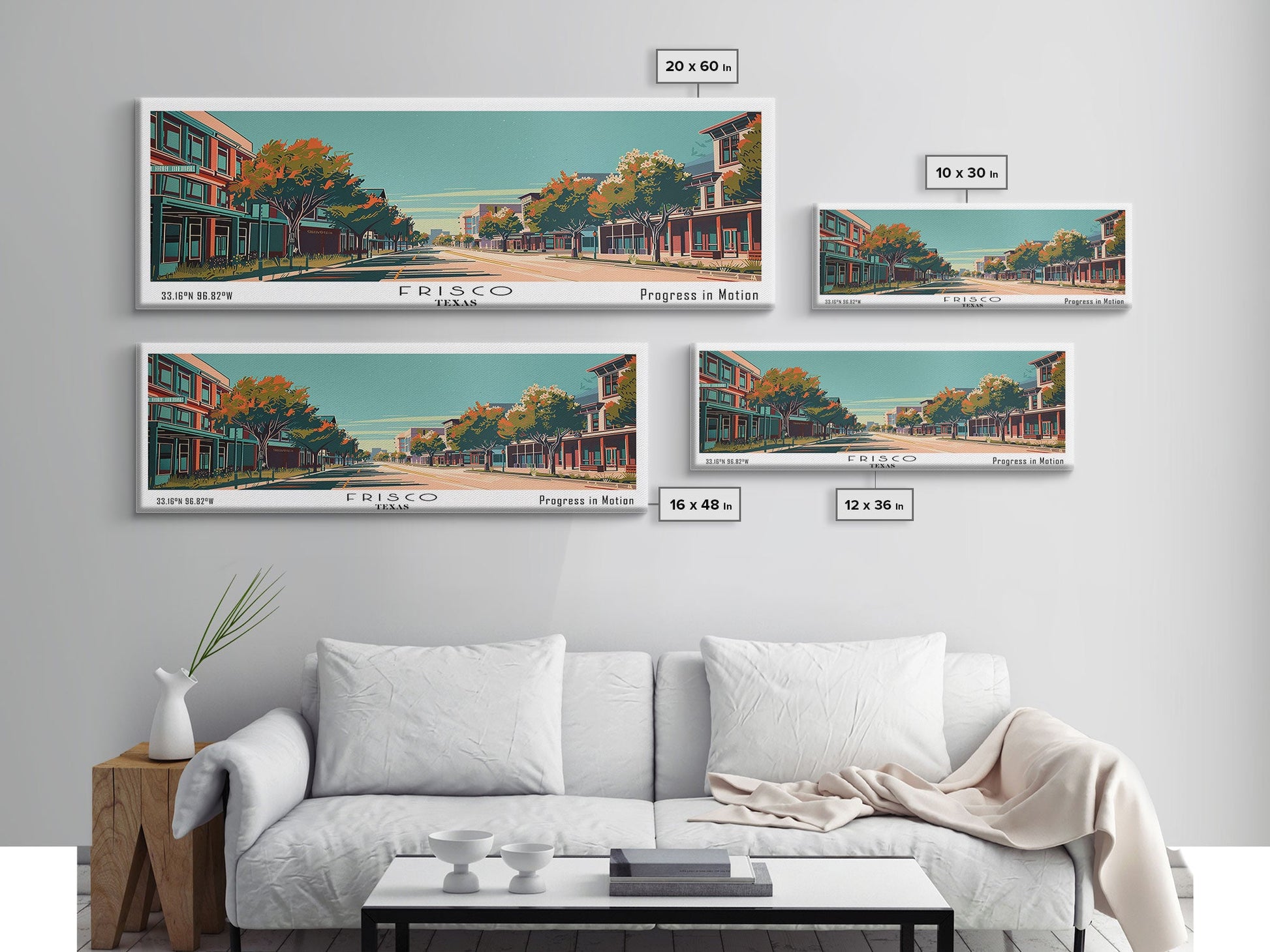 Frisco Texas Panoramic Painting, Framed Canvas Print, Mid Century Modern Wall Art, Retro Pop Art Travel Poster, Home Decor, City Art