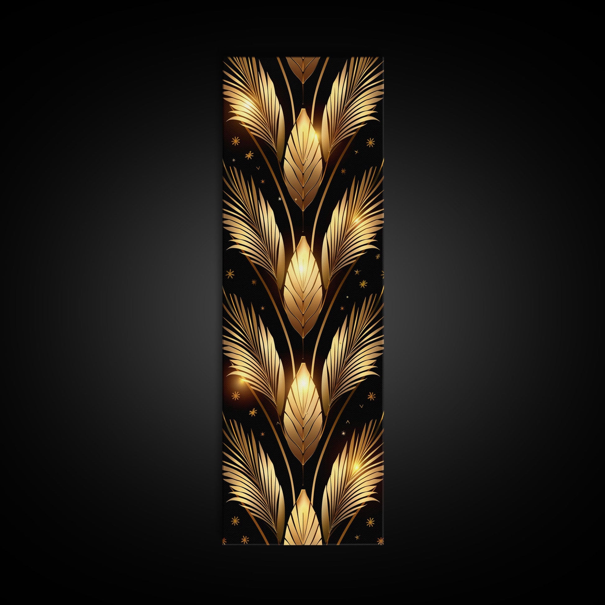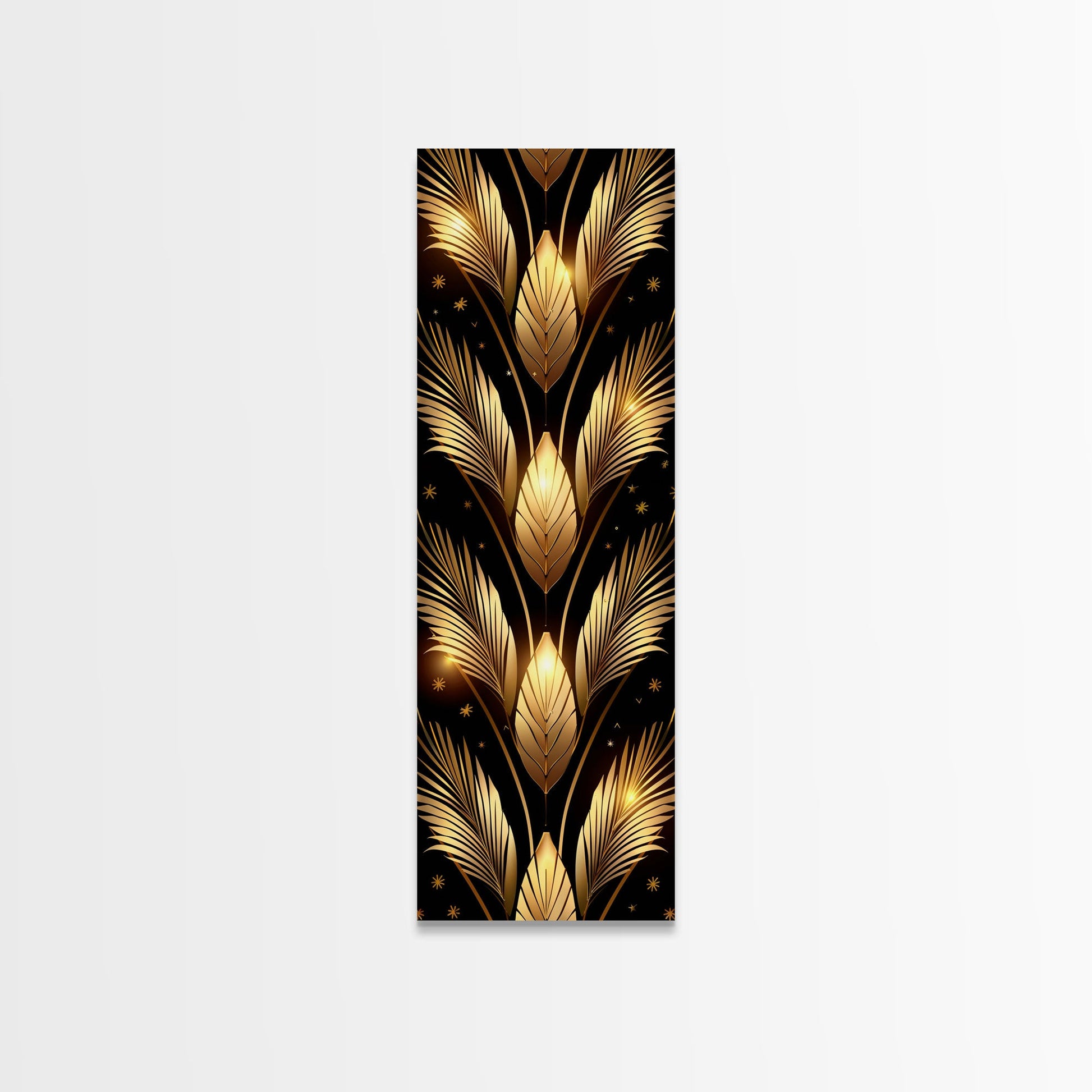 Gold Leaf Pattern on Black Background - Framed Canvas Print, Midcentury Modern Art, Skinny Art, Tall Art, Living Room Wall Decor, Minimalist Art