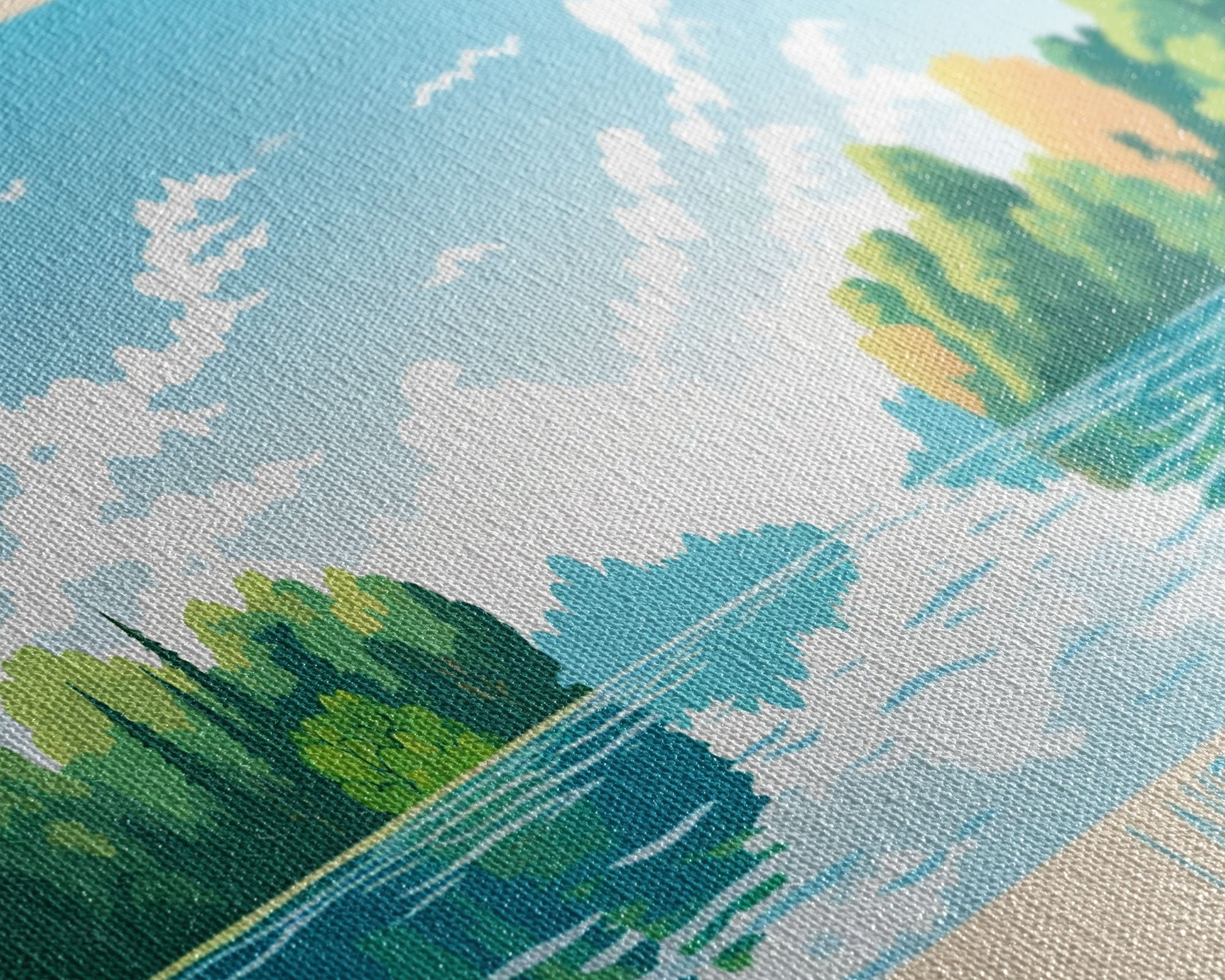 Most of our canvases are made in the USA, with the exception of canvases ordered with the light oak unstained frames, and any large canvases (24x48, 30x60, 16x48 and 20x60) ordered WITH a frame. These are temporarily made in and shipped from Europe, while we try to find a more consistent supplier in the USA.