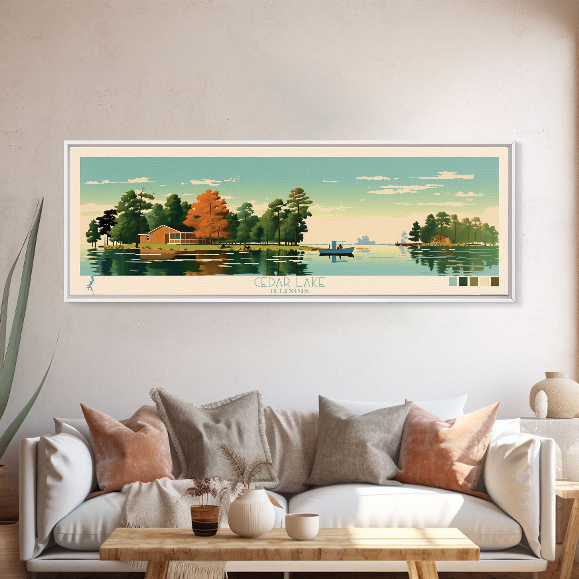 Lakes Cedar, Illinois Panoramic Wall Art Framed Canvas Print, Midcentury Modern, Pop Art, Home Decor, Travel Poster, Bedroom Art
