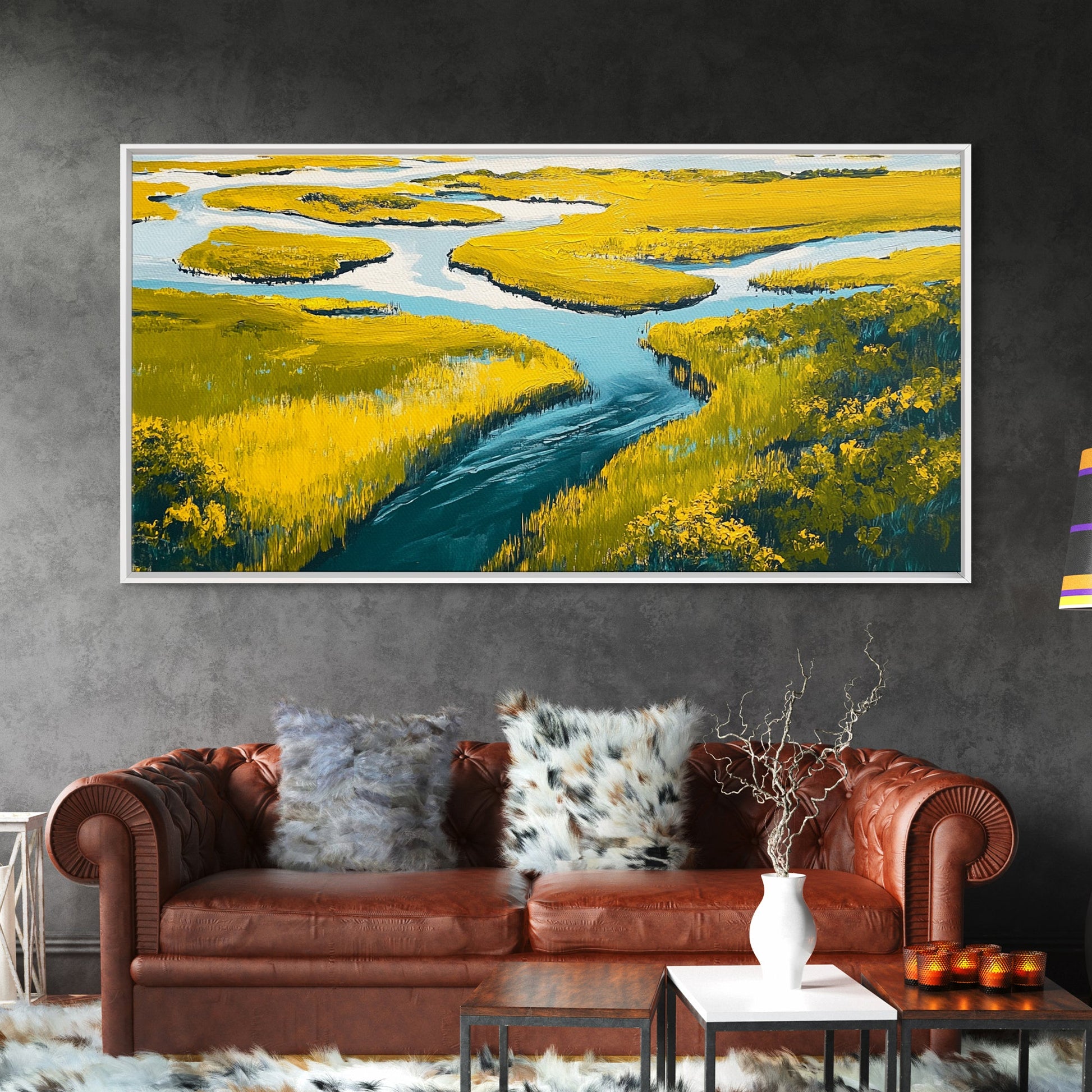 Marshland Landscape, marsh painting, landscape painting, above sofa art, extra wide art, panoramic art, Framed Canvas Print