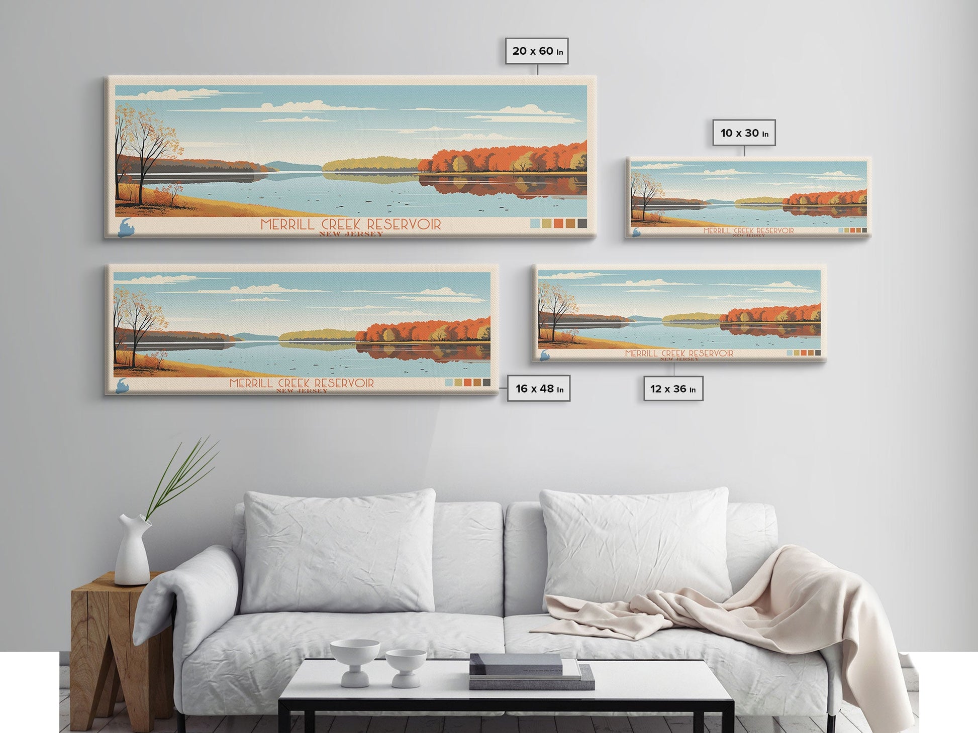 Merrill Creek Reservoir, New Jersey Panoramic Wall Art Framed Canvas Print, Midcentury Modern, Pop Art, Home Decor, Travel Poster, Living Room Art