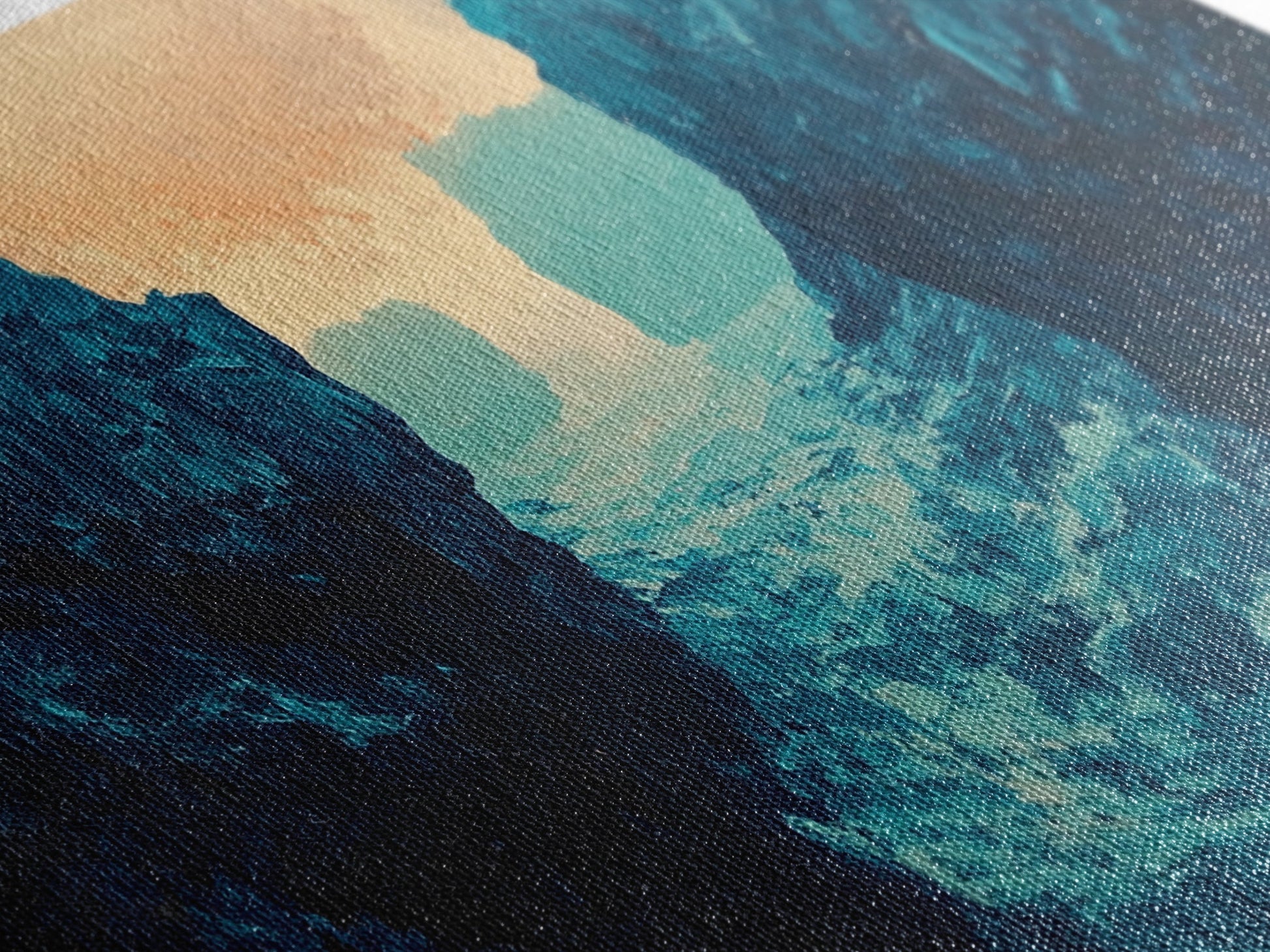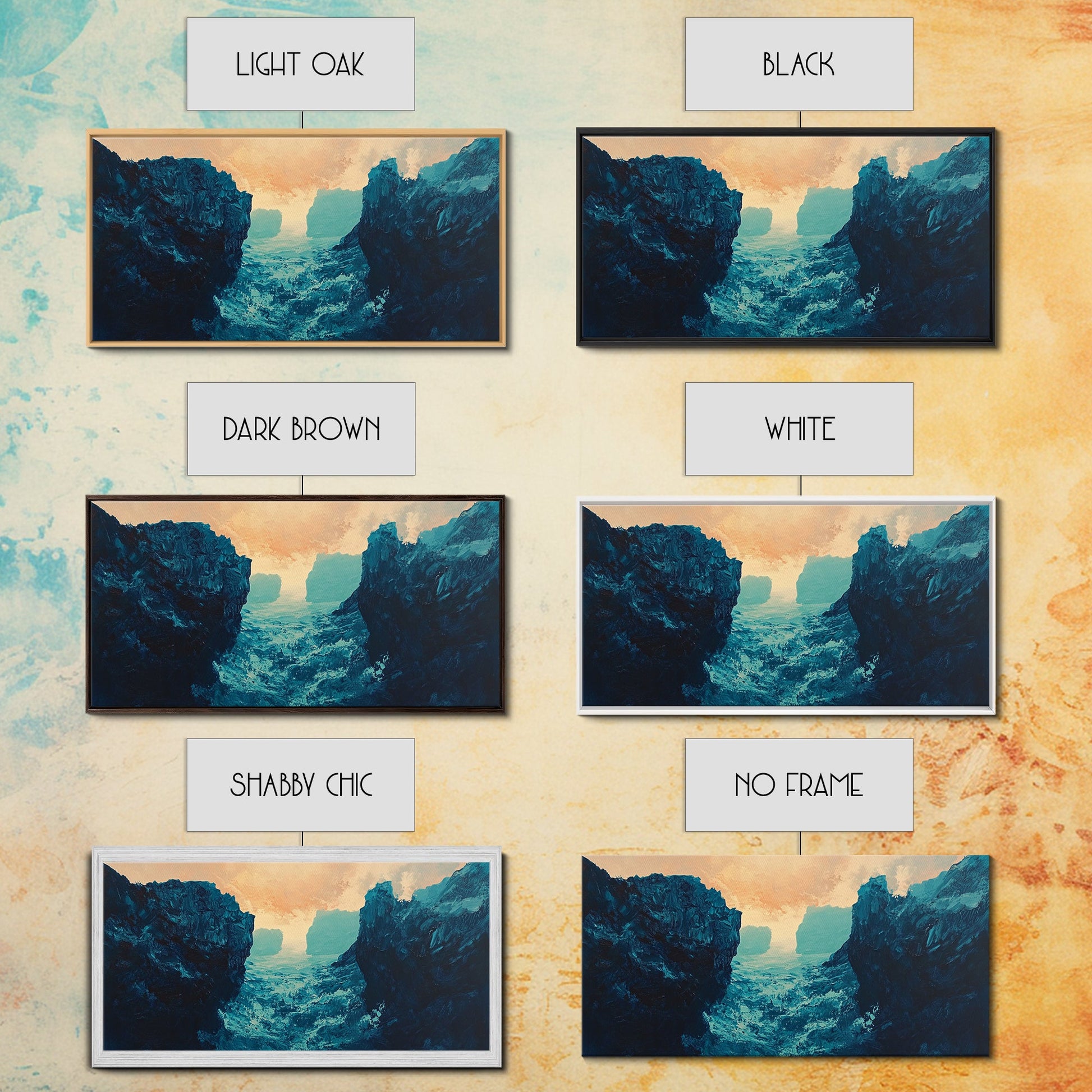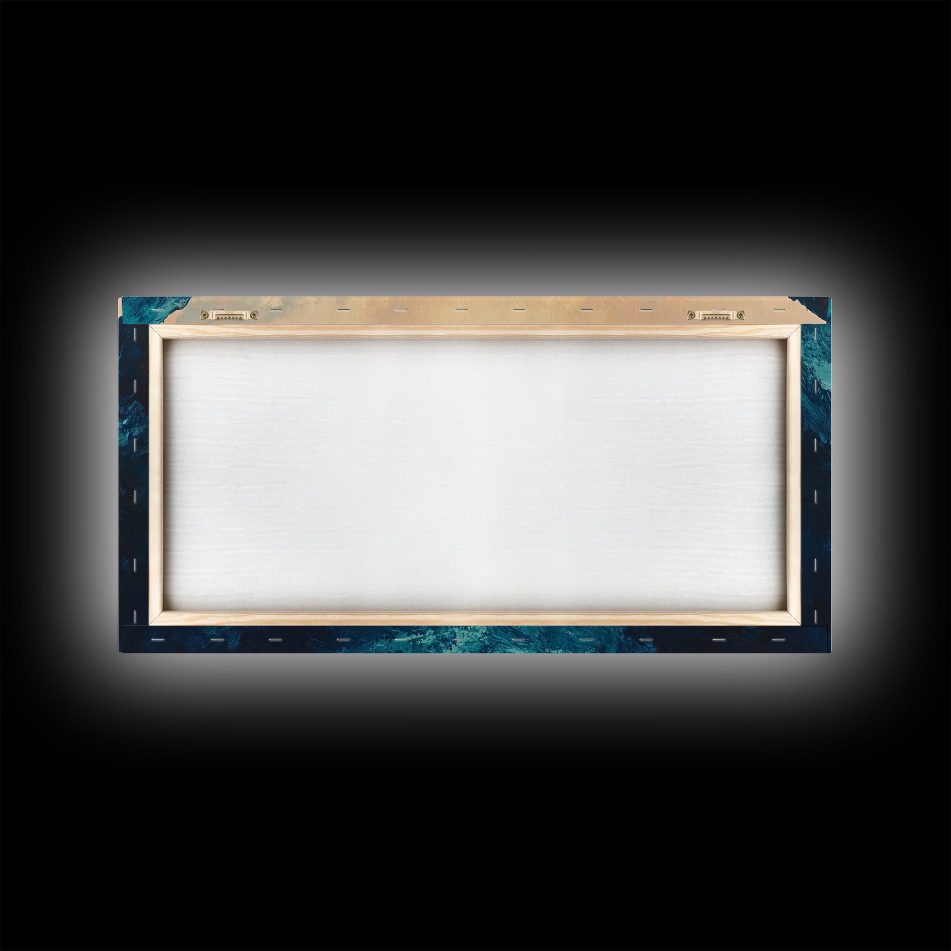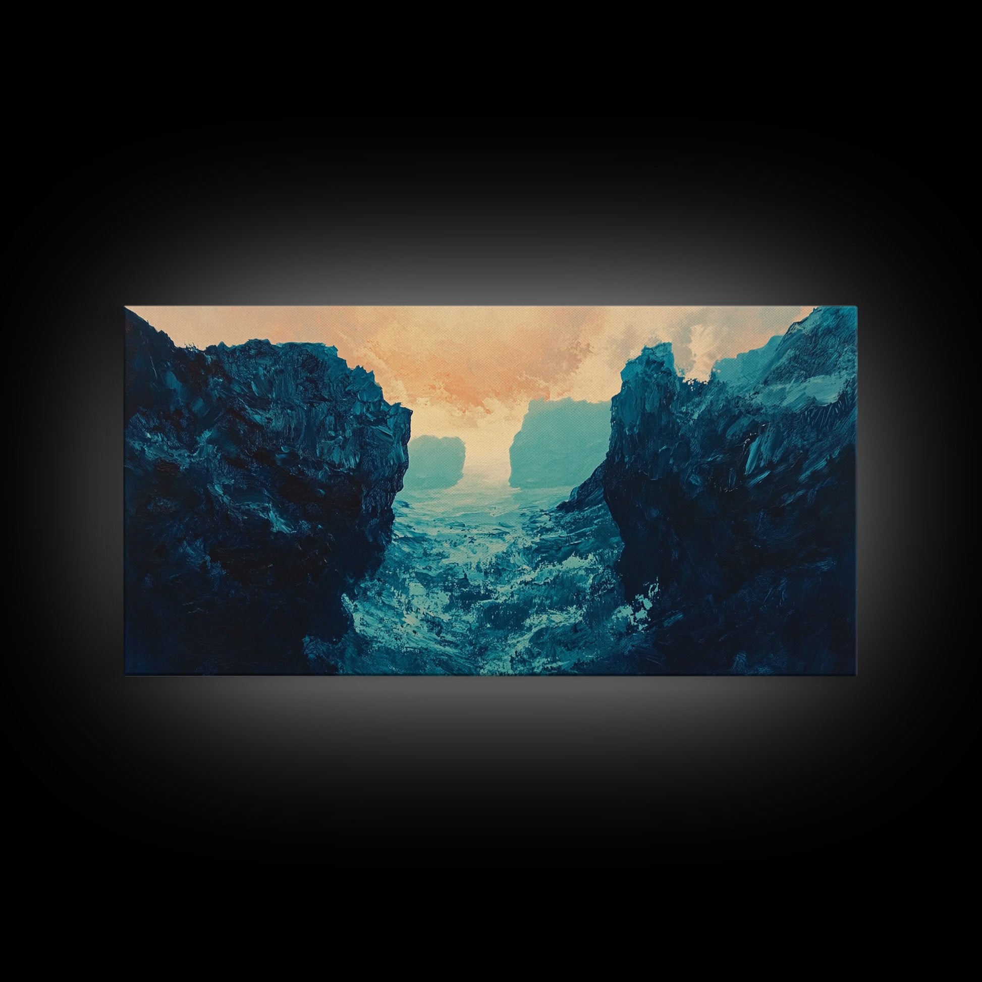 Moody Landscape, dramatic canyon, abstract oil painting, blue and green wall art, panoramic art, Framed Canvas Print, extra wide art