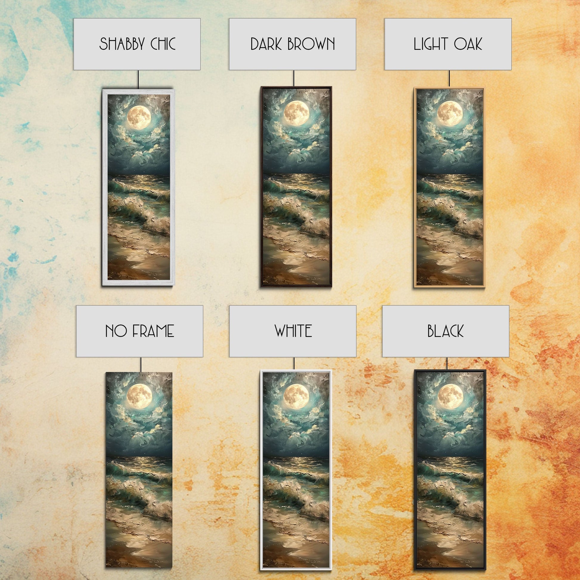 Mystical Moonlit Waves and Reflections Over the Ocean, Skinny and Tall Art, Captivating Landscape Painting, Framed Canvas Print, Wall Decor
