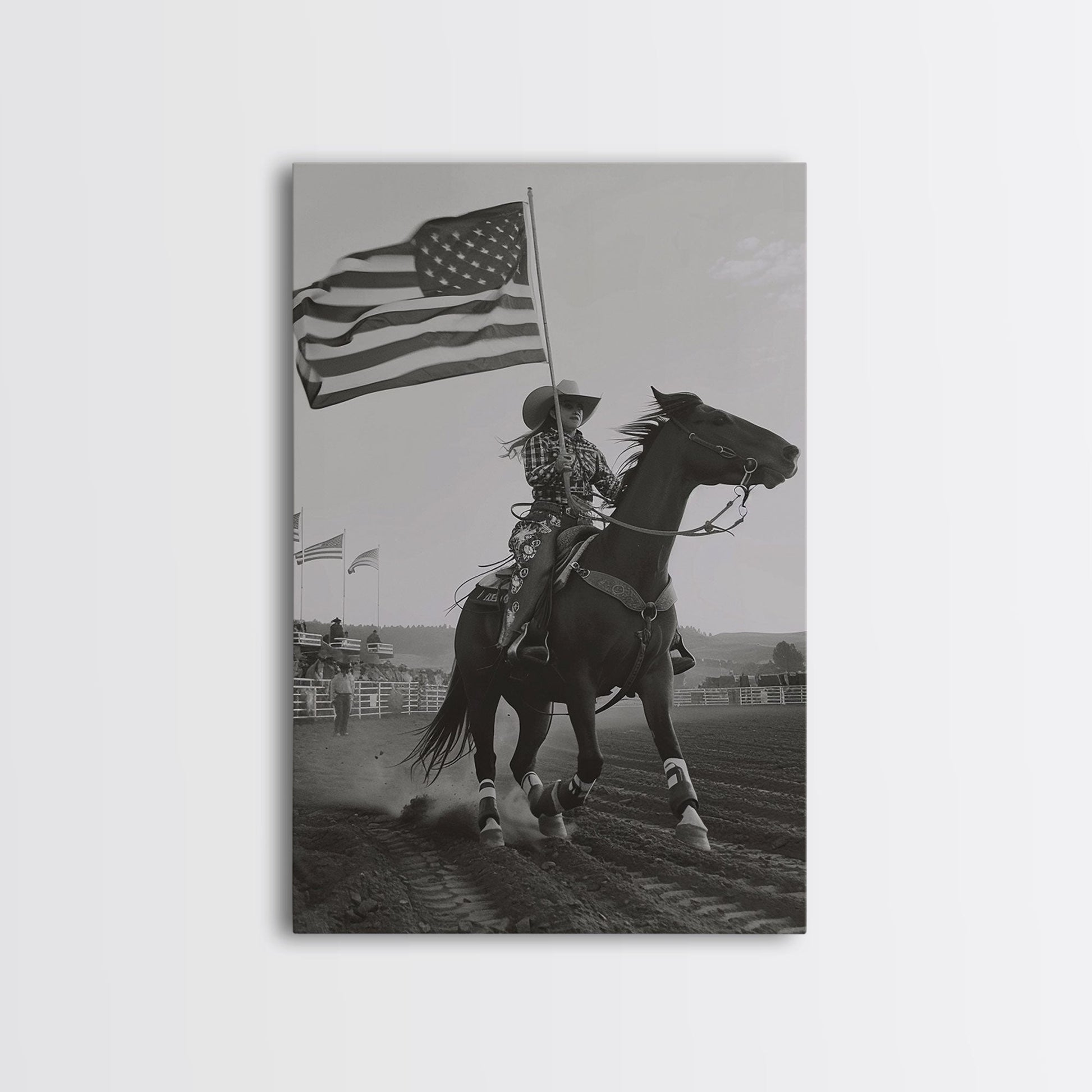 Patriotic Cowgirl with Flag Art Print, Western Rodeo Framed Canvas, Vintage Black and White Photography, Unique Wall Art