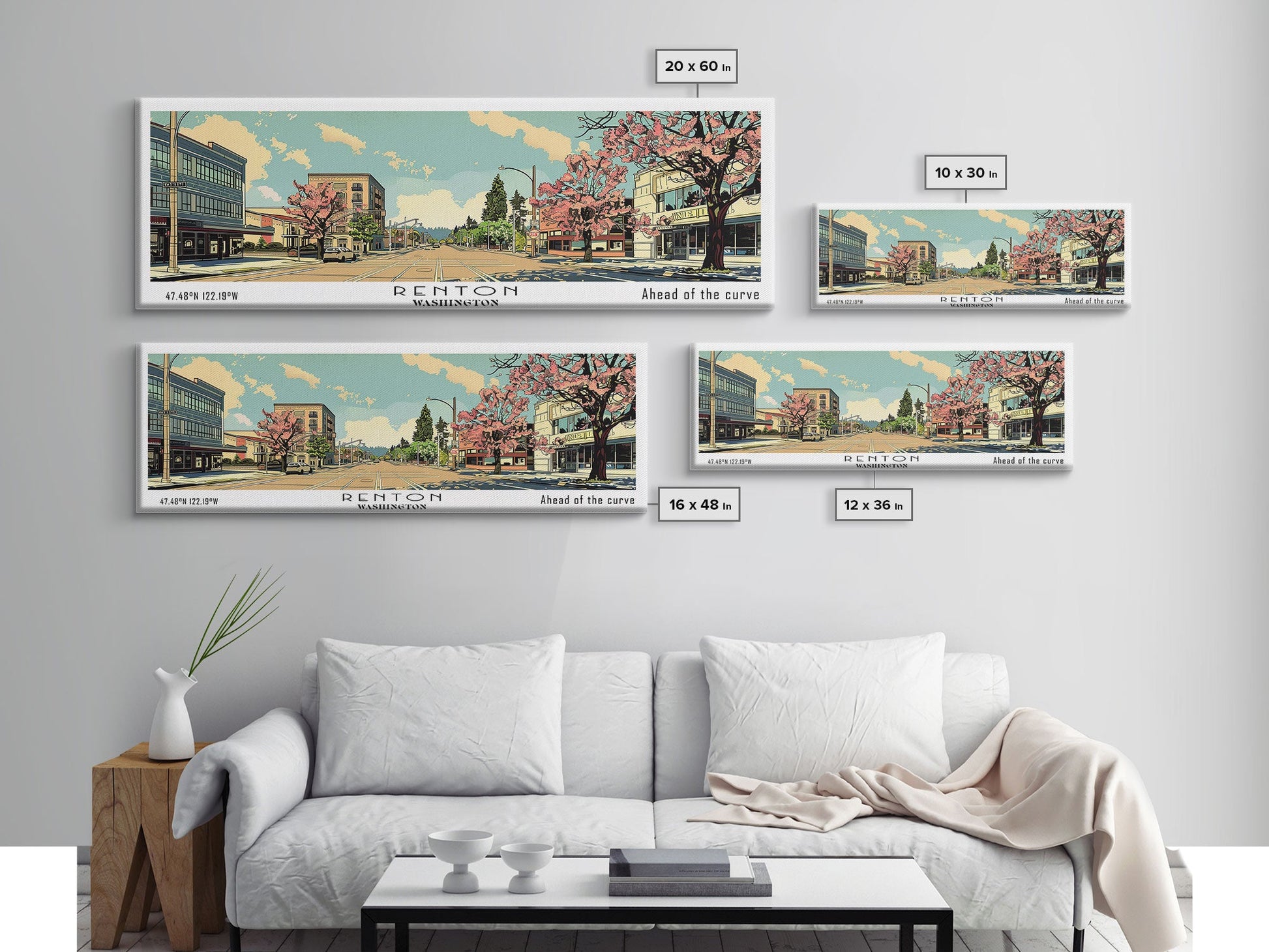 Renton Washington Panoramic Wall Art, Mid Century Modern Framed Canvas Print, Retro Pop Art Travel Poster, City Art, Office Wall Decor, Living Room Art