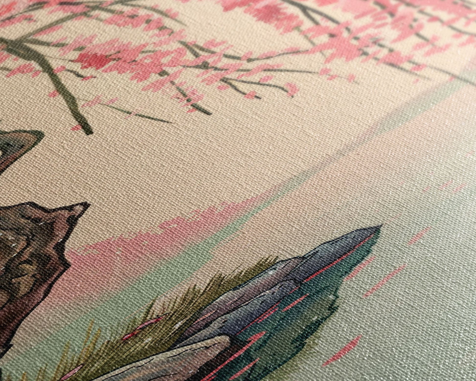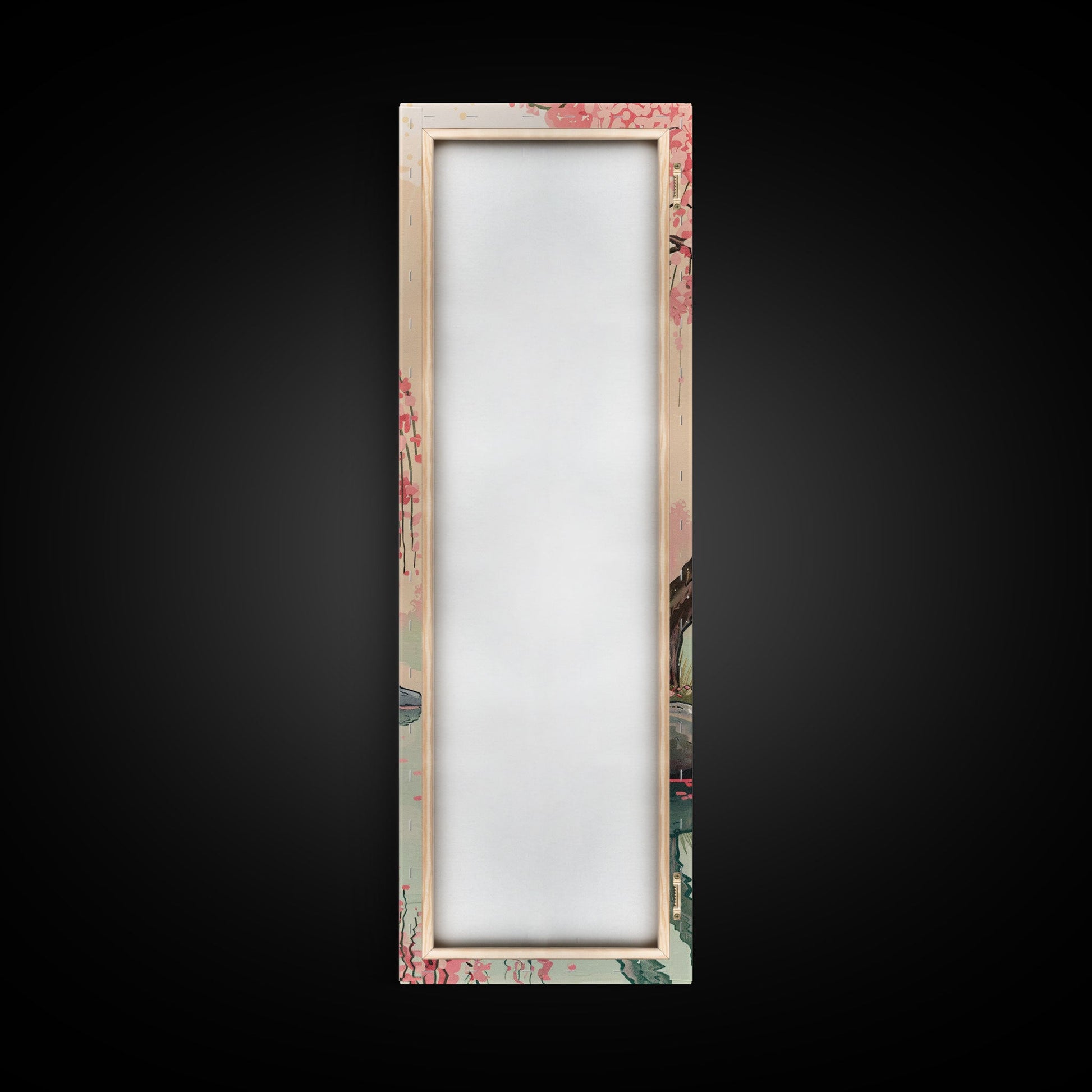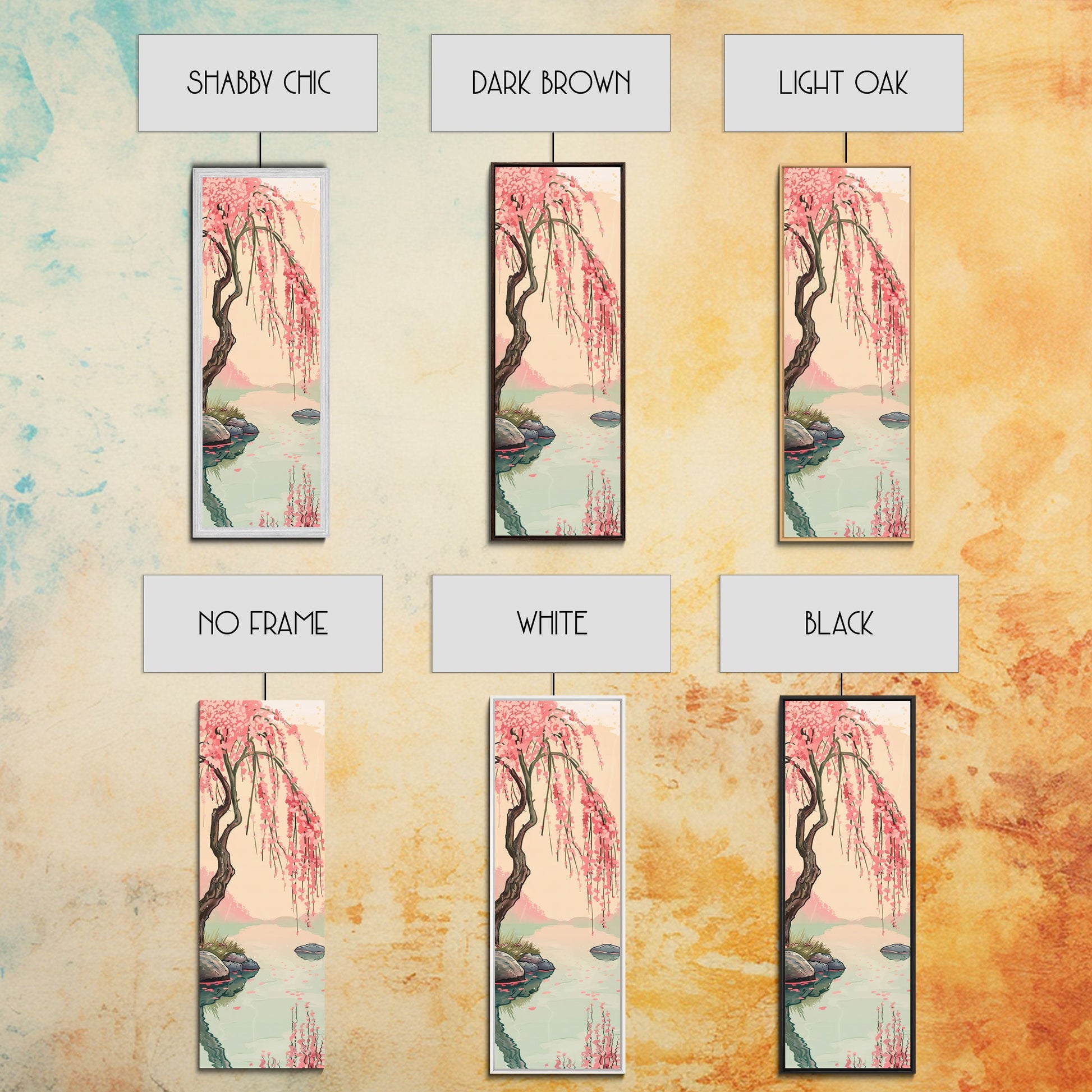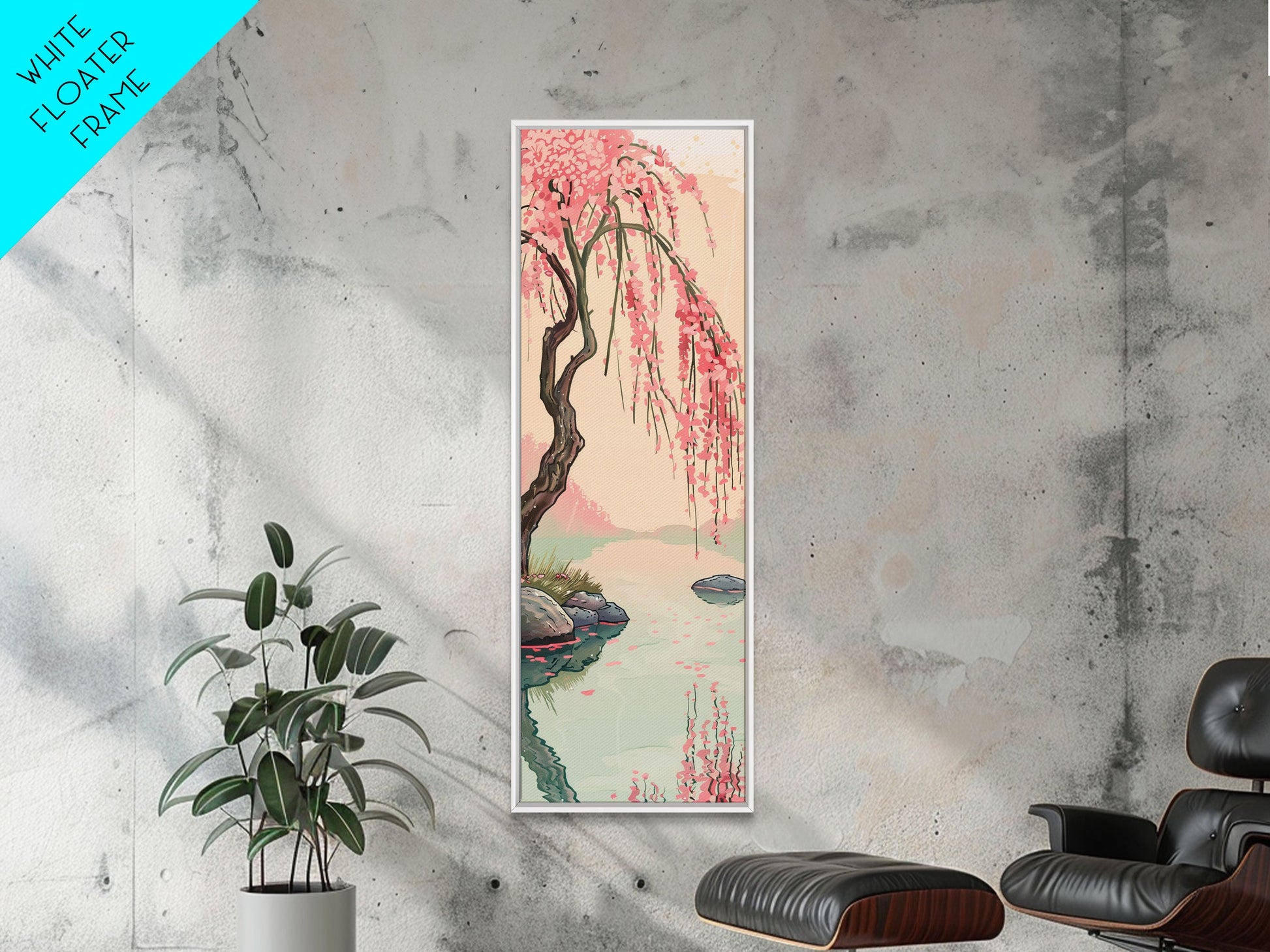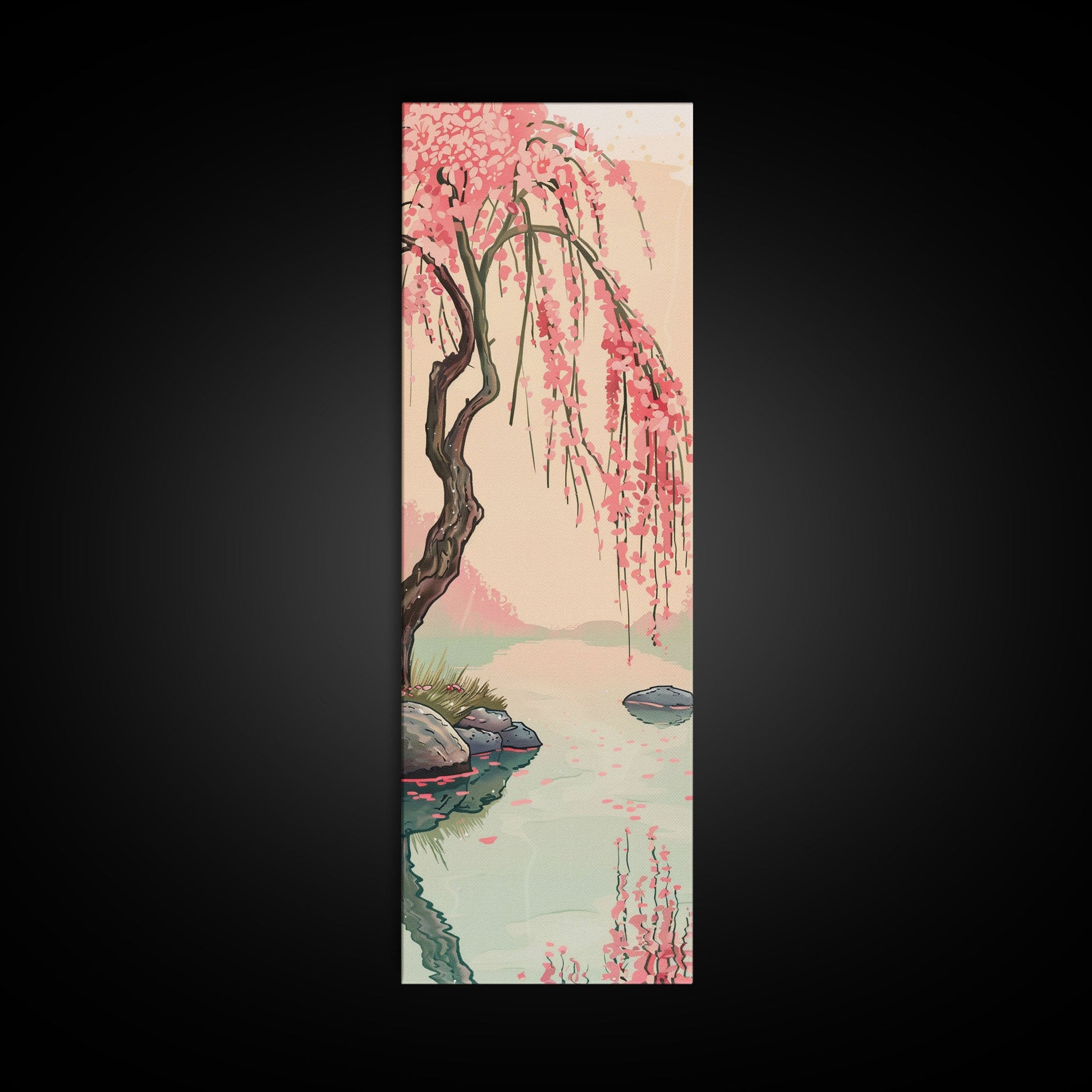 Serene Weeping Cherry Tree with Gentle Reflections in Water - Skinny Art, Japanese Wall Decor, Framed Canvas Print, Ukiyo-e Style