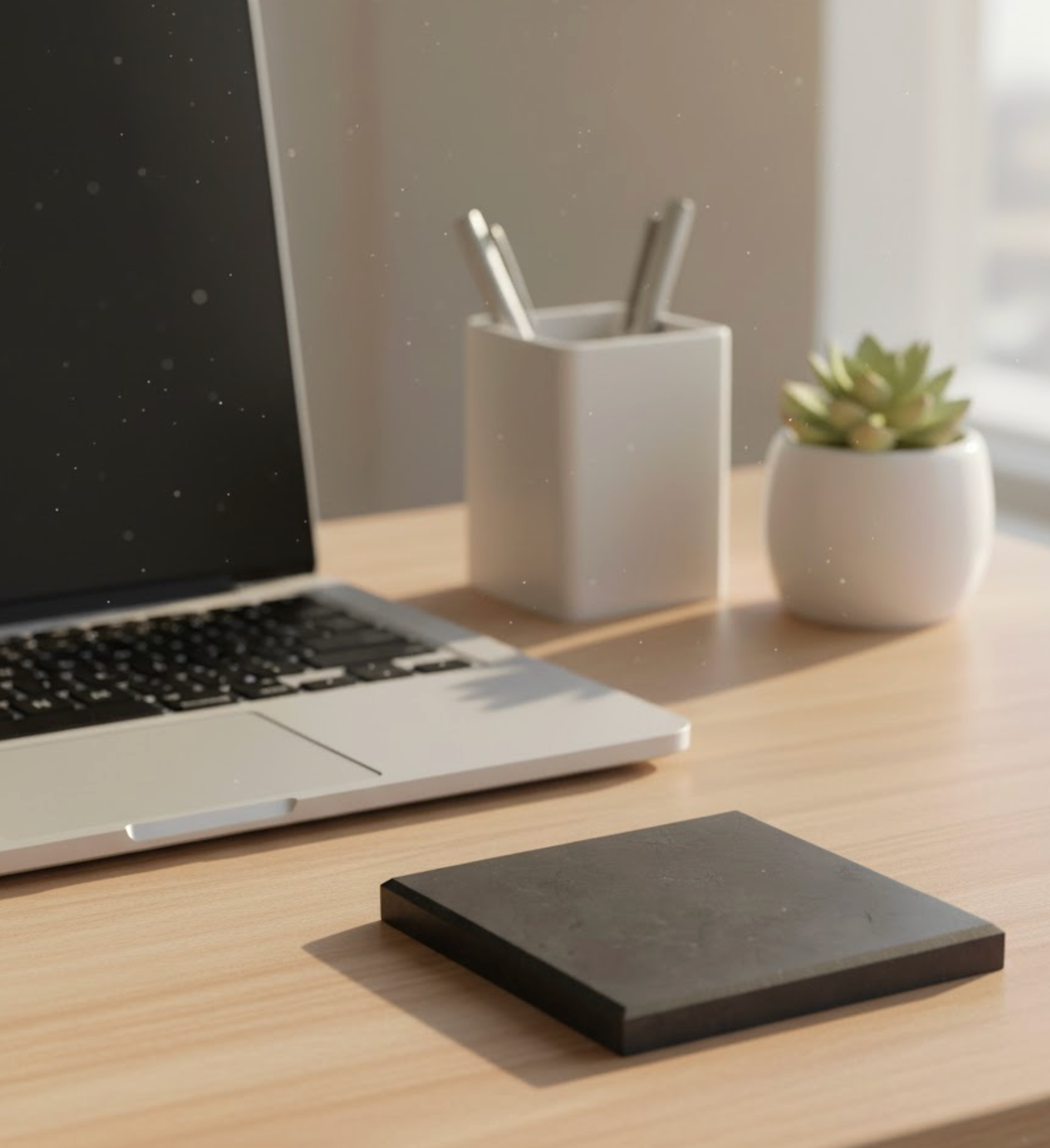 For crystal care, rest your jewelry or stones directly on the plate to naturally cleanse and refresh their energy. For EMF-conscious spaces, place the plate beneath or beside your phone, Wi-Fi router, or computer to create a protective, grounding field. Keep it on a nightstand or altar to encourage deeper rest, stability, and a more settled nervous system. Its minimal, matte-black profile also functions as a sculptural accent, ideal for intentional interiors.