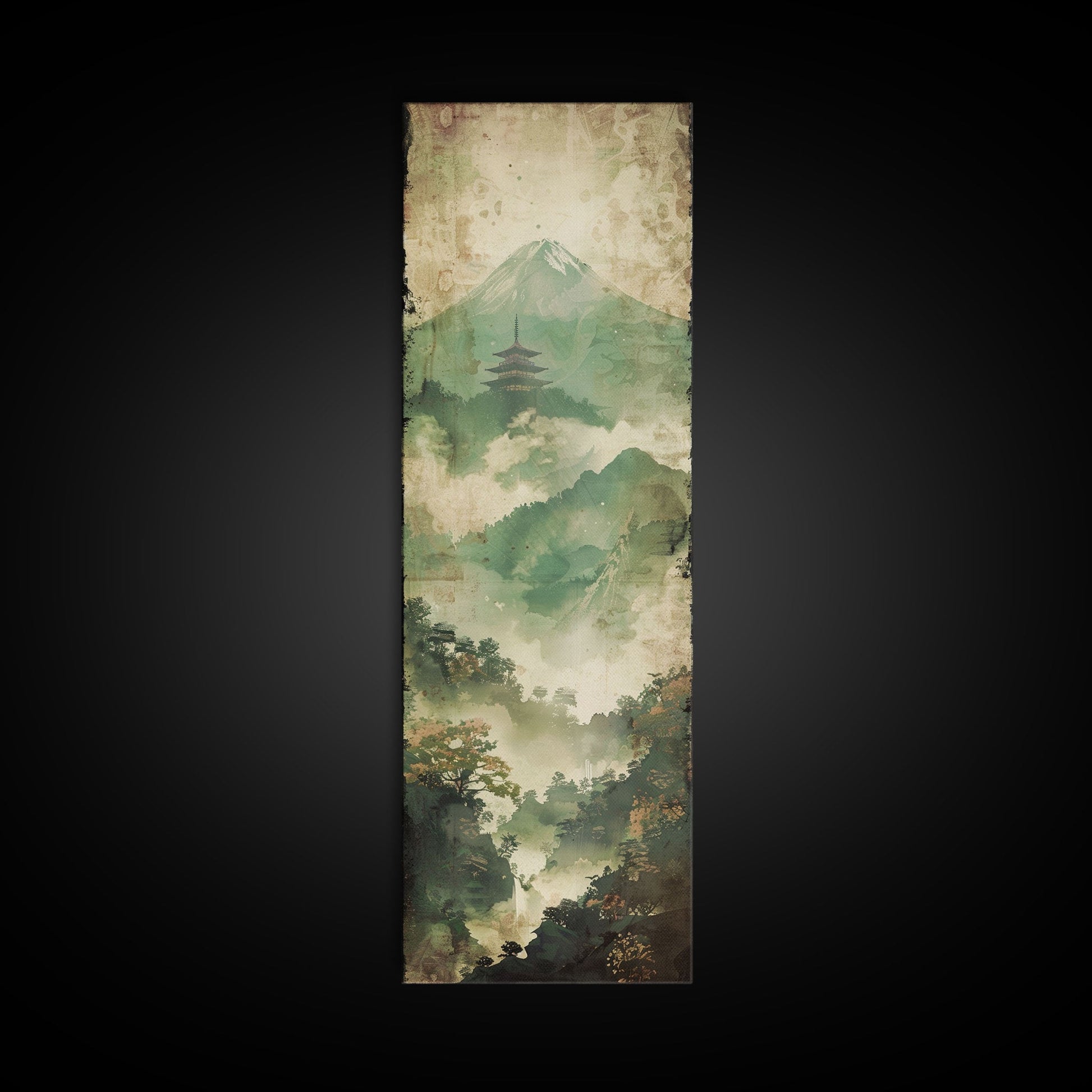 Skinny Art Tall Art Framed Canvas Print Japanese Style Art Foggy Mountain Temple Landscape Wood Block Print Ukiyo-e Feng Shui Wall Art
