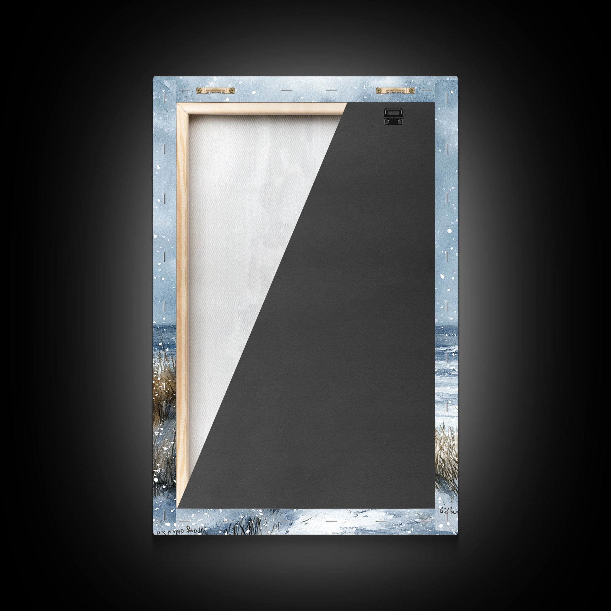 Snowy lighthouse wrapped with festive garland, Framed Canvas Print, beach Christmas decor, holiday wall art perfect for coastal homes