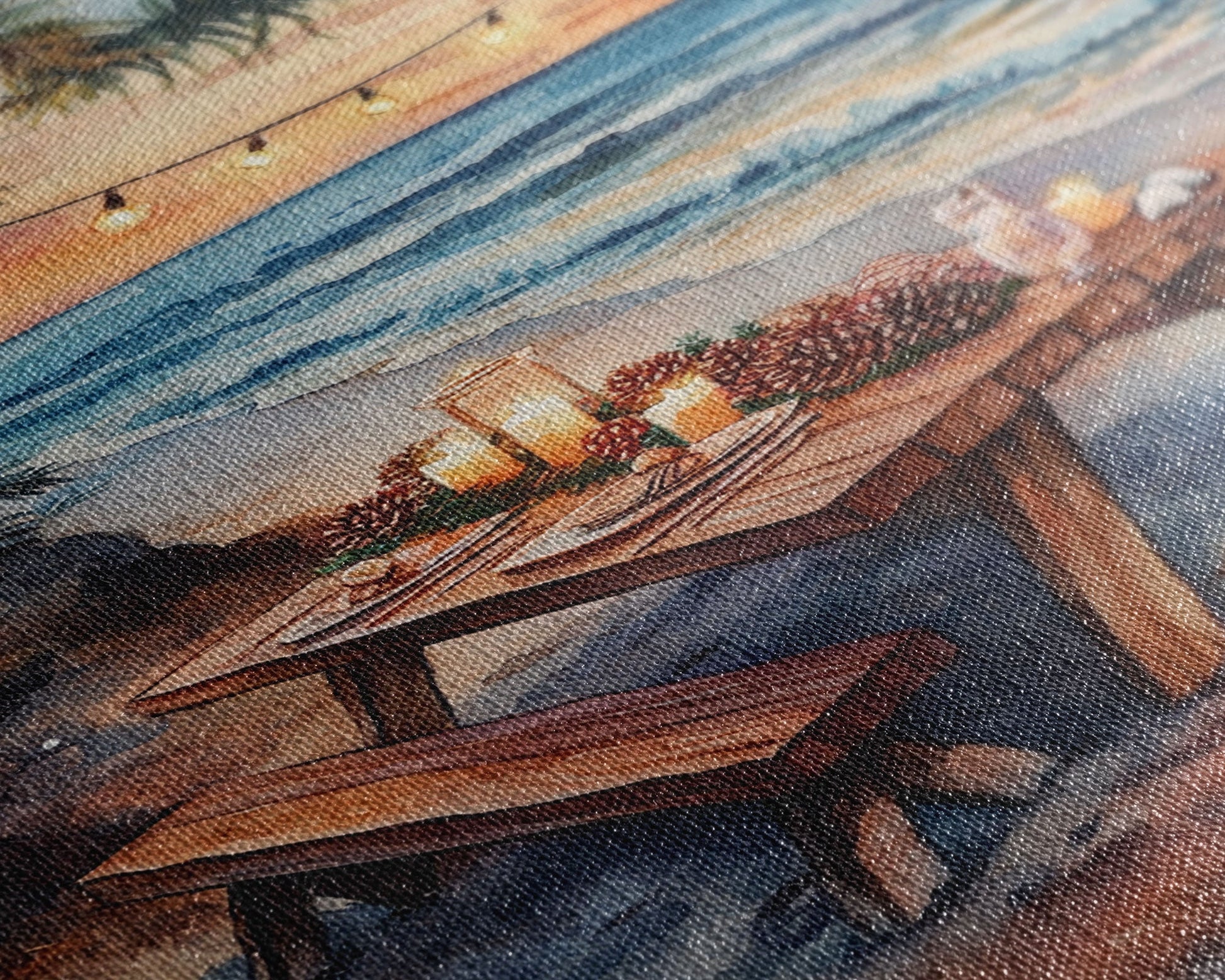 Sunset beach picnic with holiday lights and candles, coastal Christmas decor Framed Canvas Print, perfect tropical holiday art idea