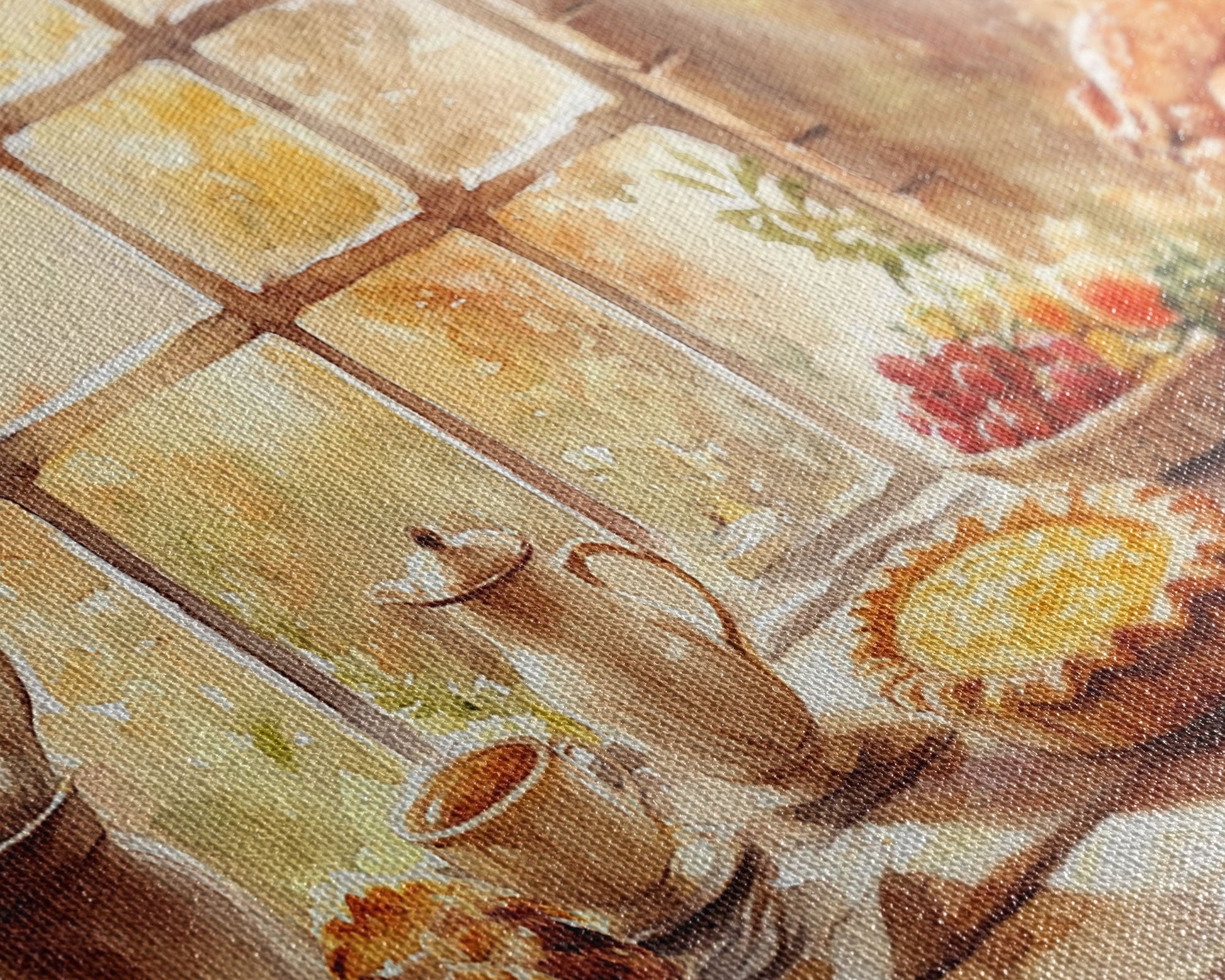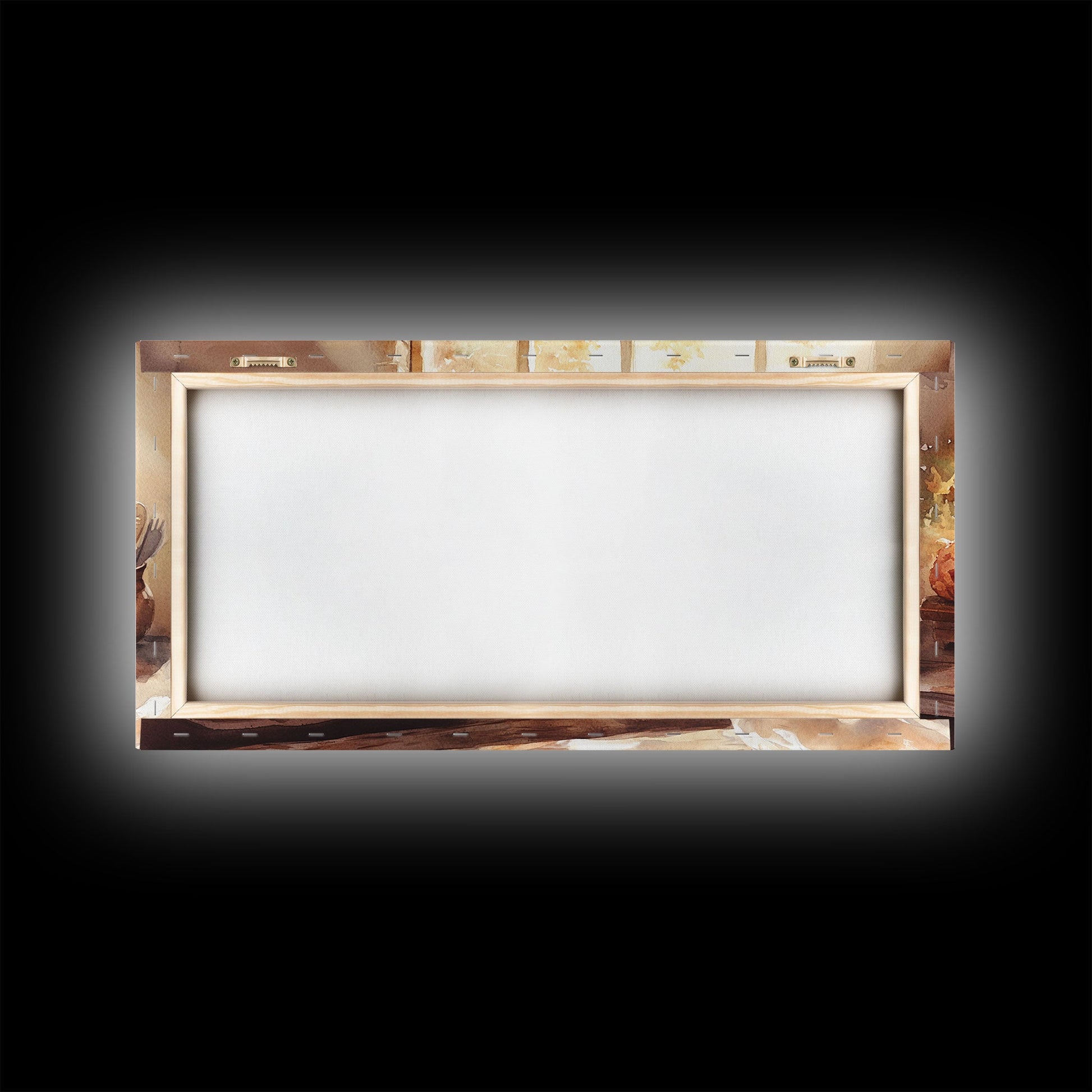 Thanksgiving table scene with food, pies and fall decor, Framed Canvas Print with pumpkins sunlight, autumn harvest home wall art and decor