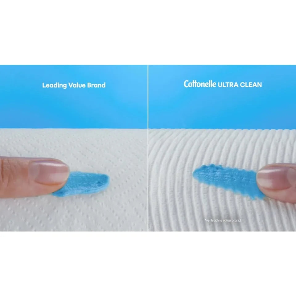 ['12 Super Mega Rolls of Cottonelle Ultra Clean Toilet Paper; 426 sheets per roll; Cottonelle toilet paper packaging and product may vary\nSuperior Clean: Each Cottonelle toilet paper roll is made with strong CleaningRipples that are designed to clean better (than the leading US value brand)\nThick & Strong: Our toilet tissue is 3x thicker and stronger (per sheet vs. the leading US value brand)\nRemoves More in One Wipe: Our bath tissue removes residue, reduces odor, and is designed for sensitive skin (vs. the leading US value brand)\nCottonelle Ultra Clean Toilet Paper is free of added perfumes and dyes\nCottonelle 1-ply toilet tissue is FSC certified, supporting responsible forestry and only uses fibers that are 100% plant-based\nPair Cottonelle toilet paper with Cottonelle flushable wipes together to remove up to 100% of residue and odor (using wet + dry vs. dry alone)\nOrder Cottonelle toilet tissue online with delivery to your door or pickup in store']