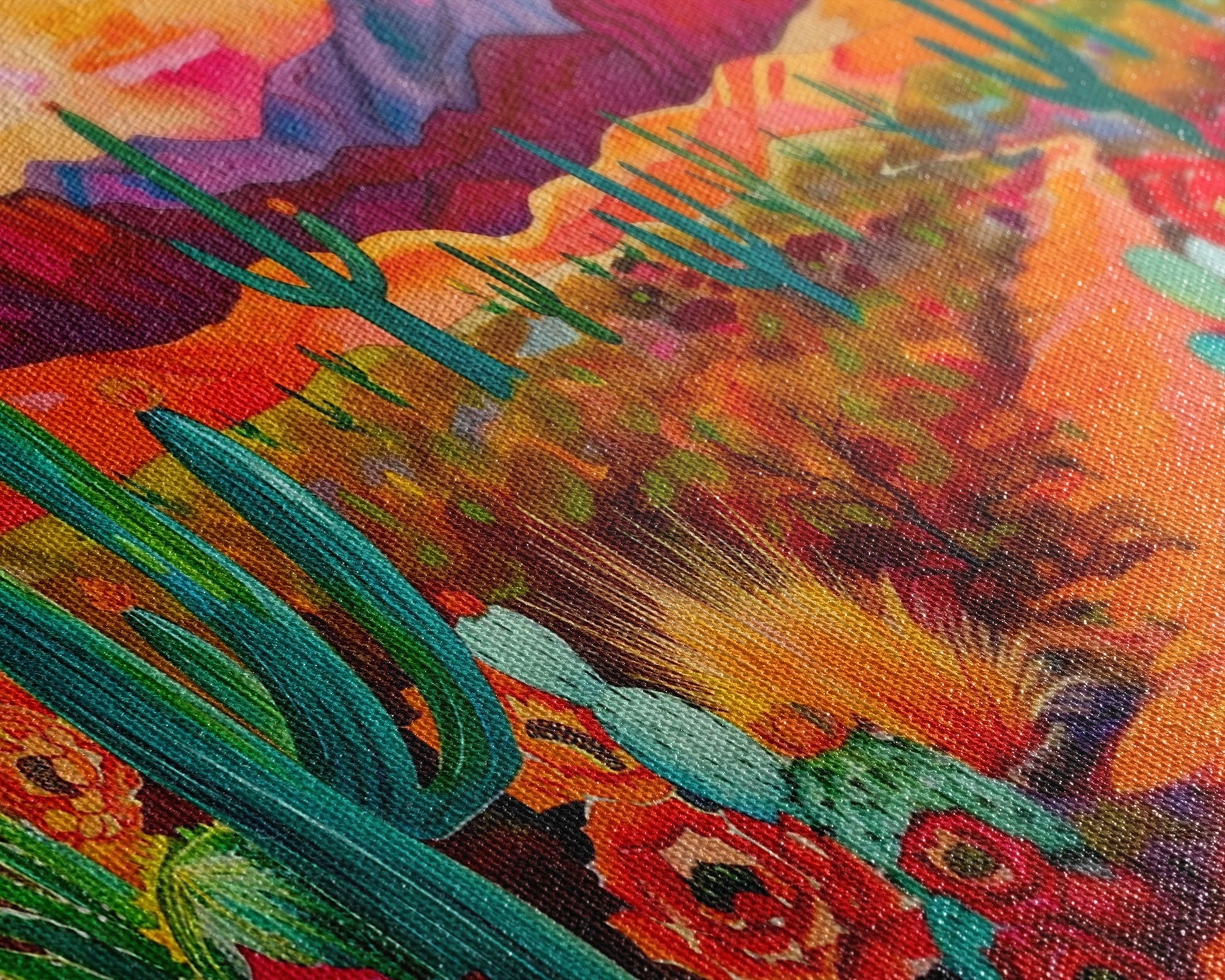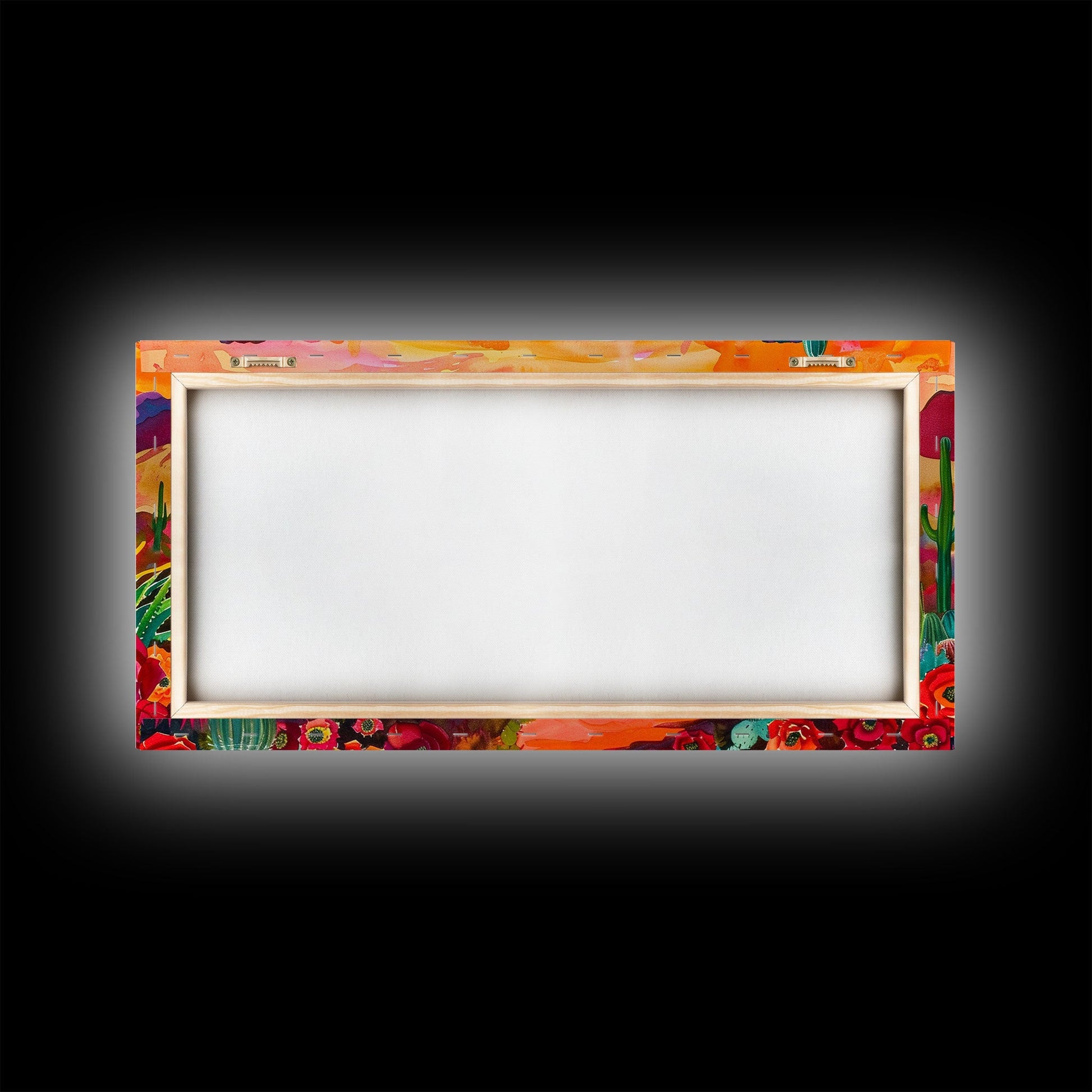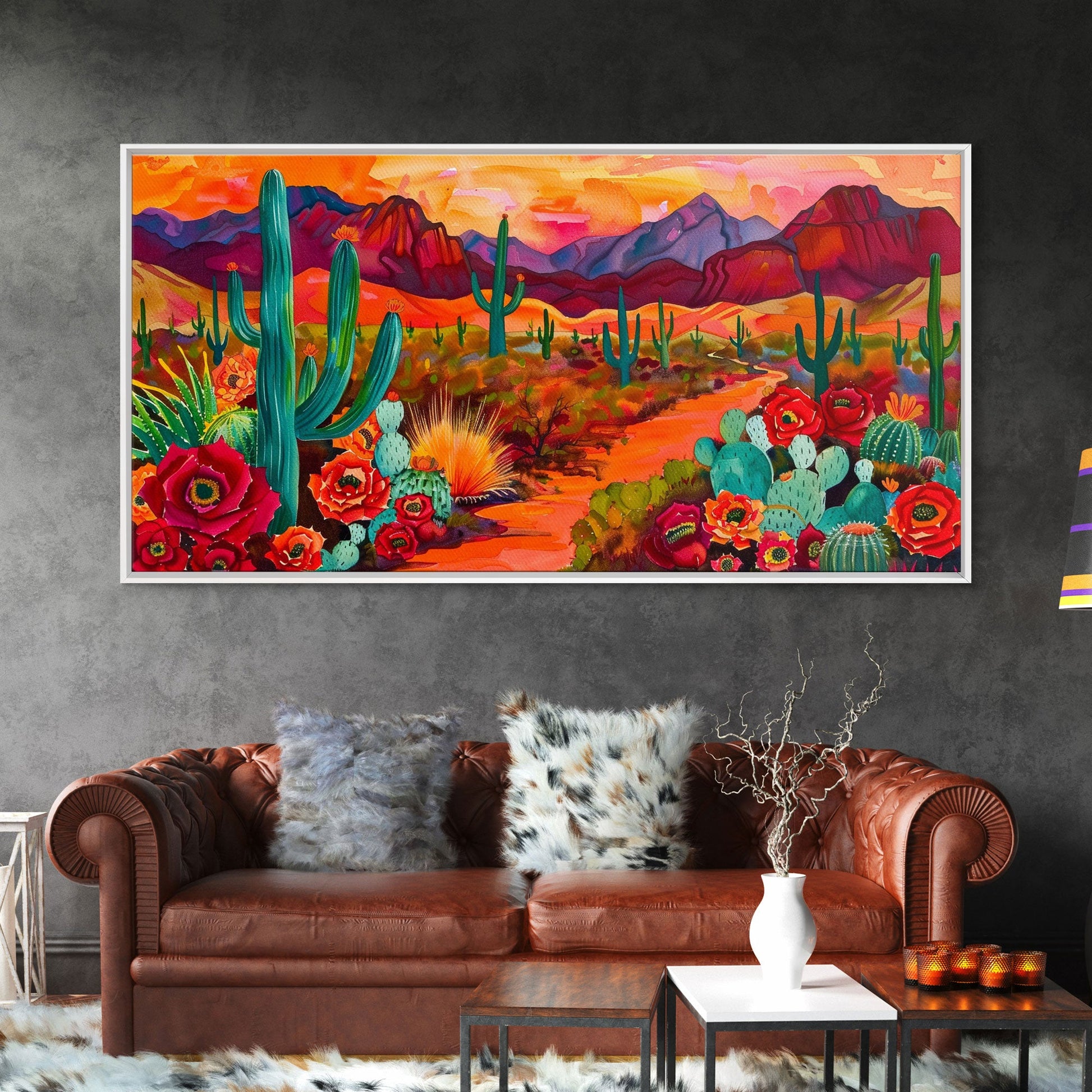 Vibrant desert scene with cacti and blooming flowers, Framed Canvas Print for boho living room, southwestern home decor art