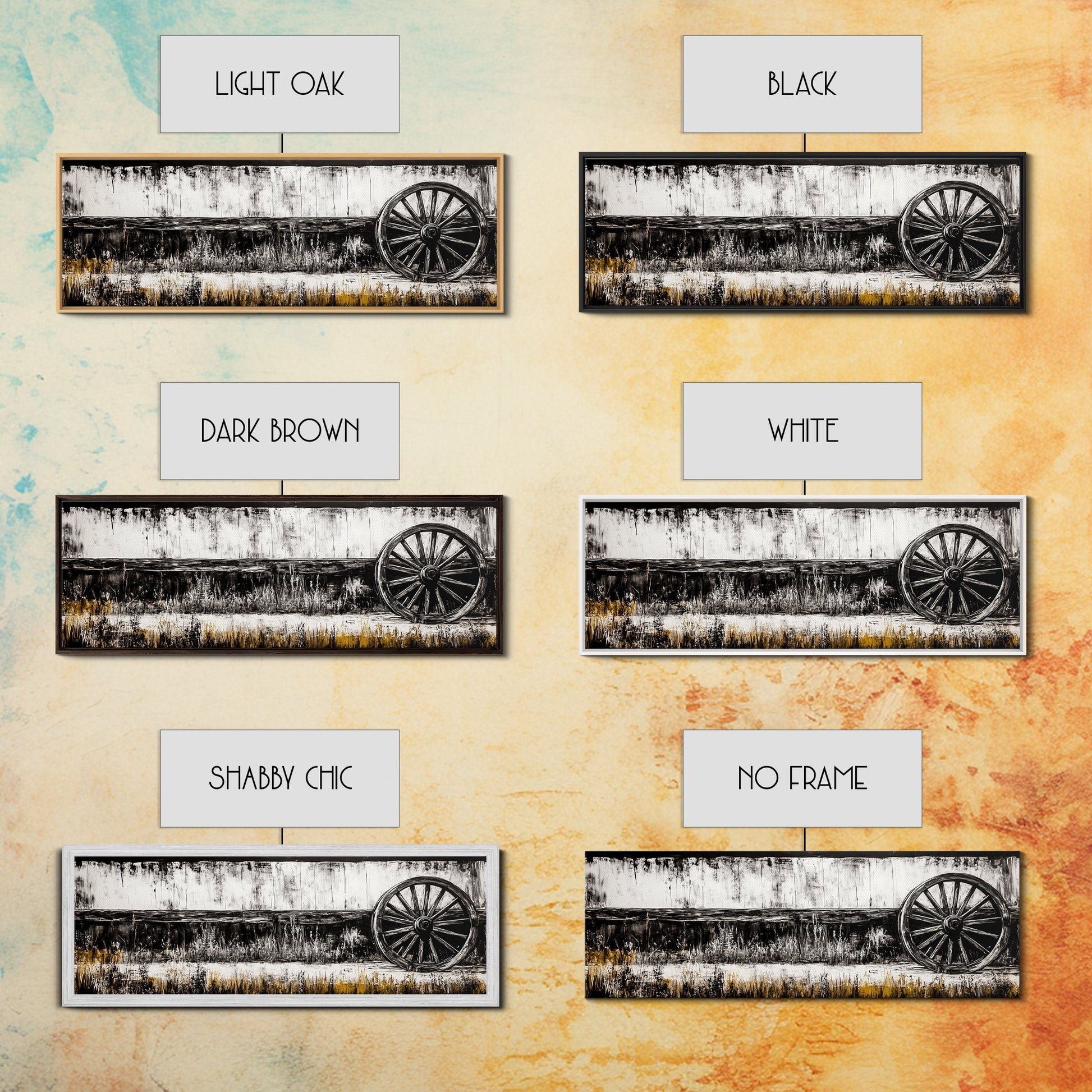 Wagon Wheel, barn landscape oil painting, black and white art, rustic decor, farmhouse art, extra wide art, Framed Canvas Print, moody art