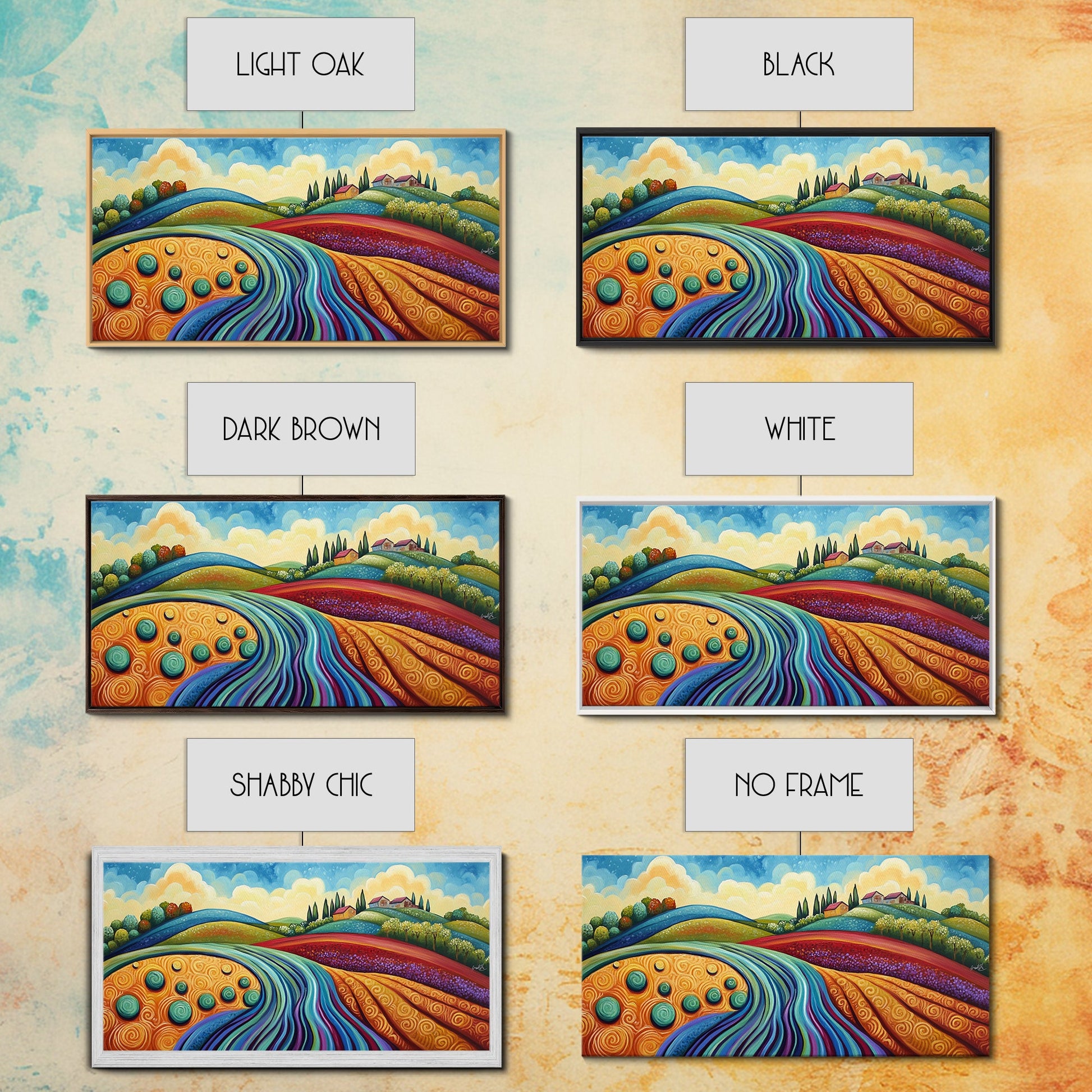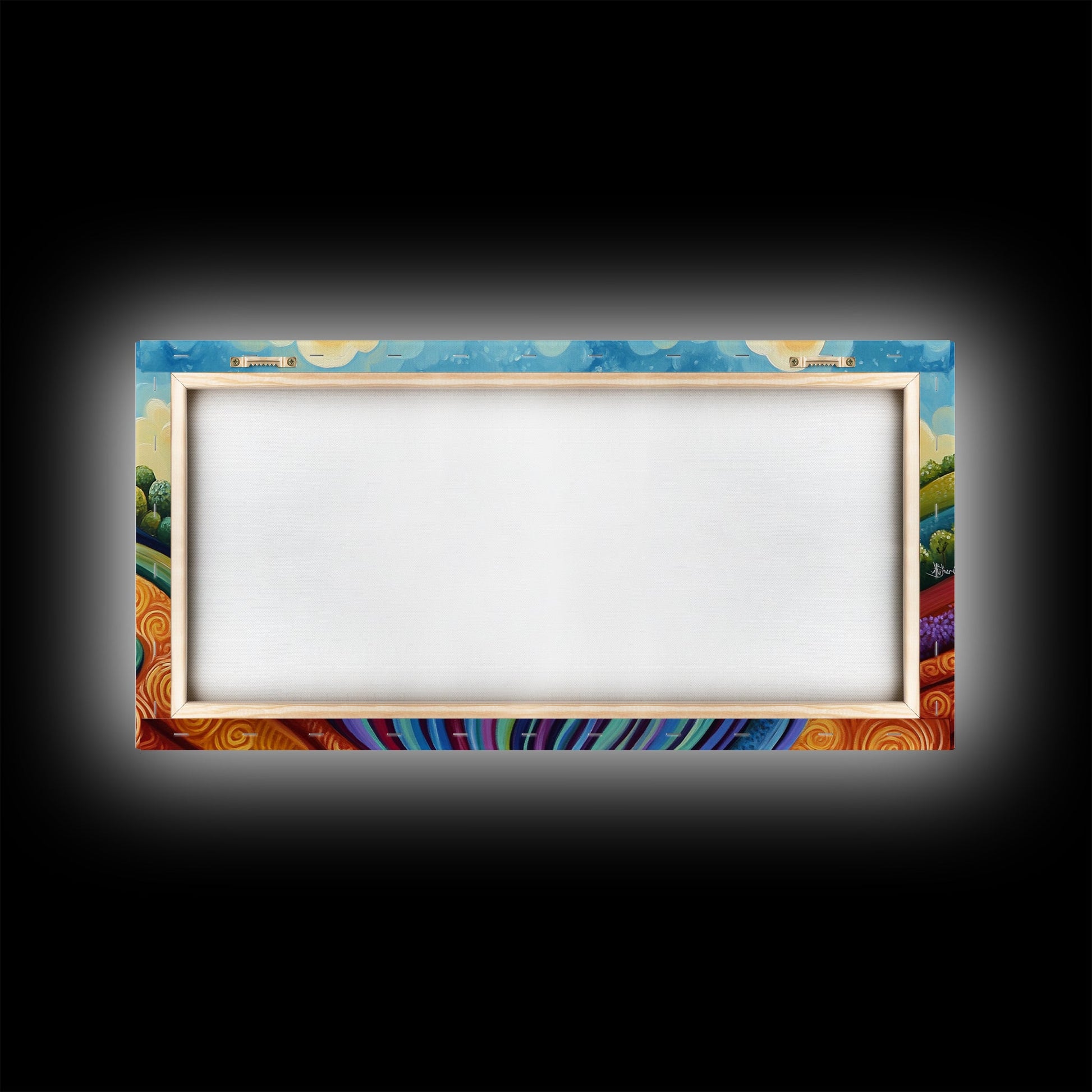 Whimsical Hills, rolling landscape, colorful fields, abstract nature, bold painting, extra wide art, Framed Canvas Print, rustic art