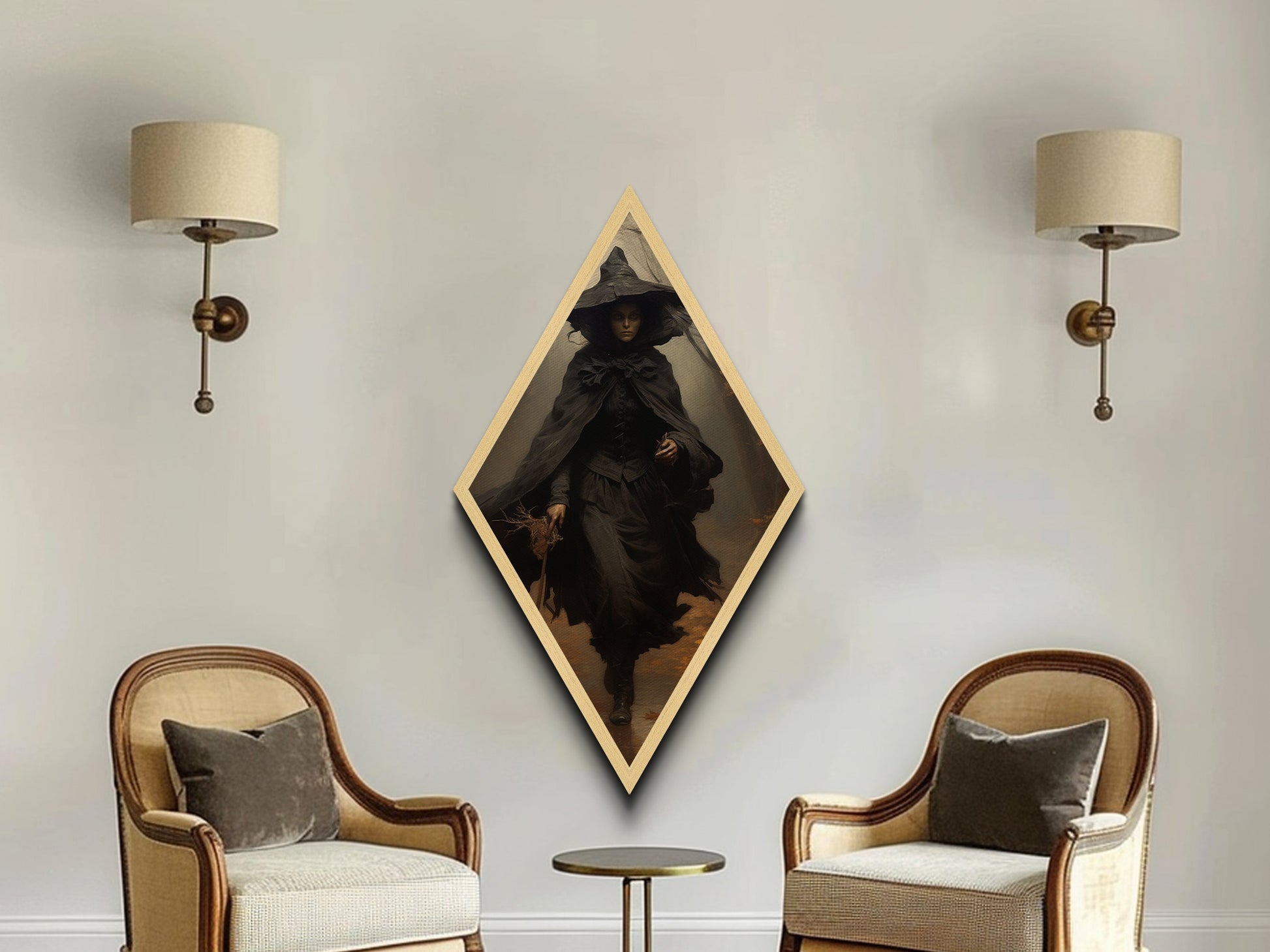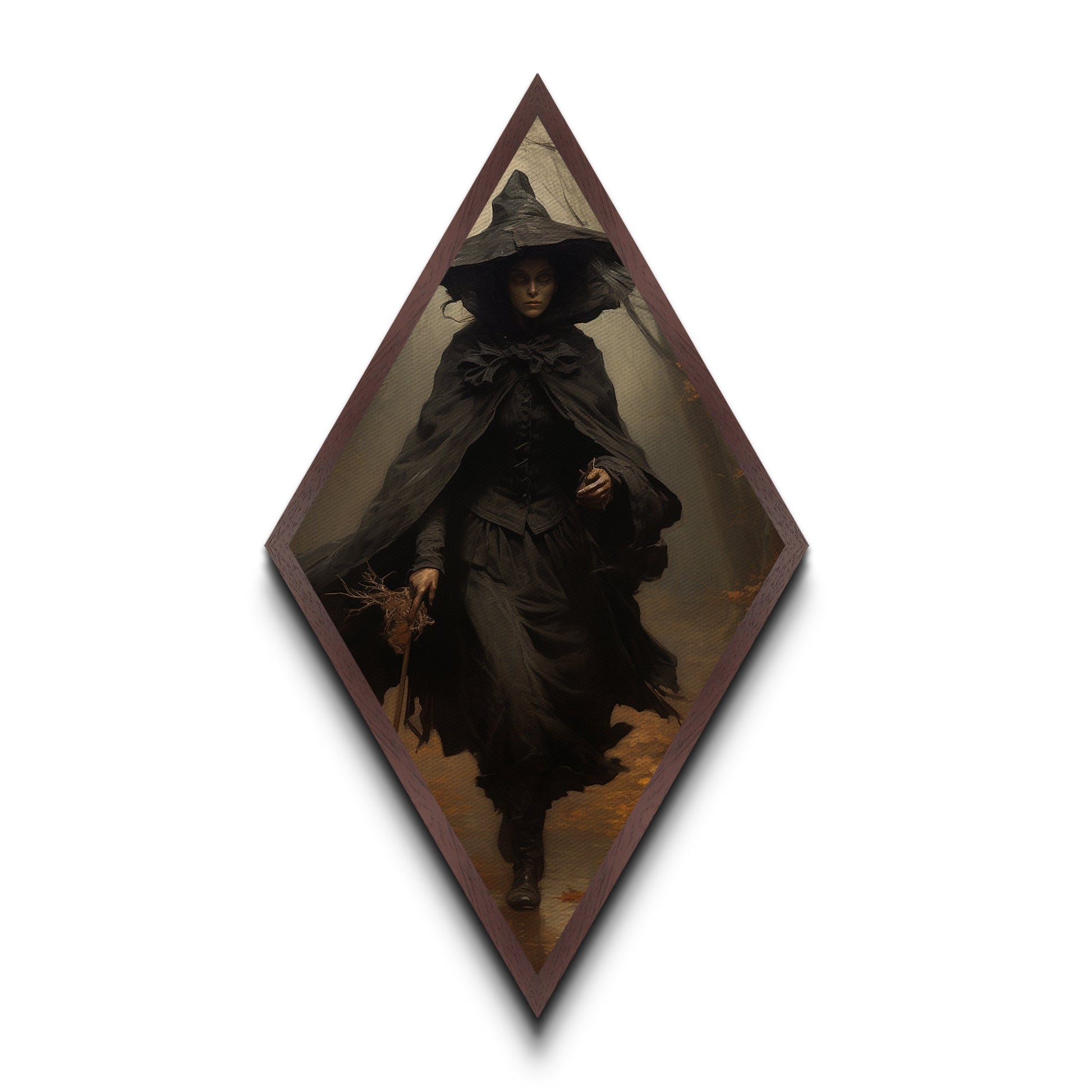 "Witch in the Woods" Canvas Embossed Print of Gothic Forest Sorceress, Diamond Shaped Art for Dark Academia Halloween or Victorian Occult Decor